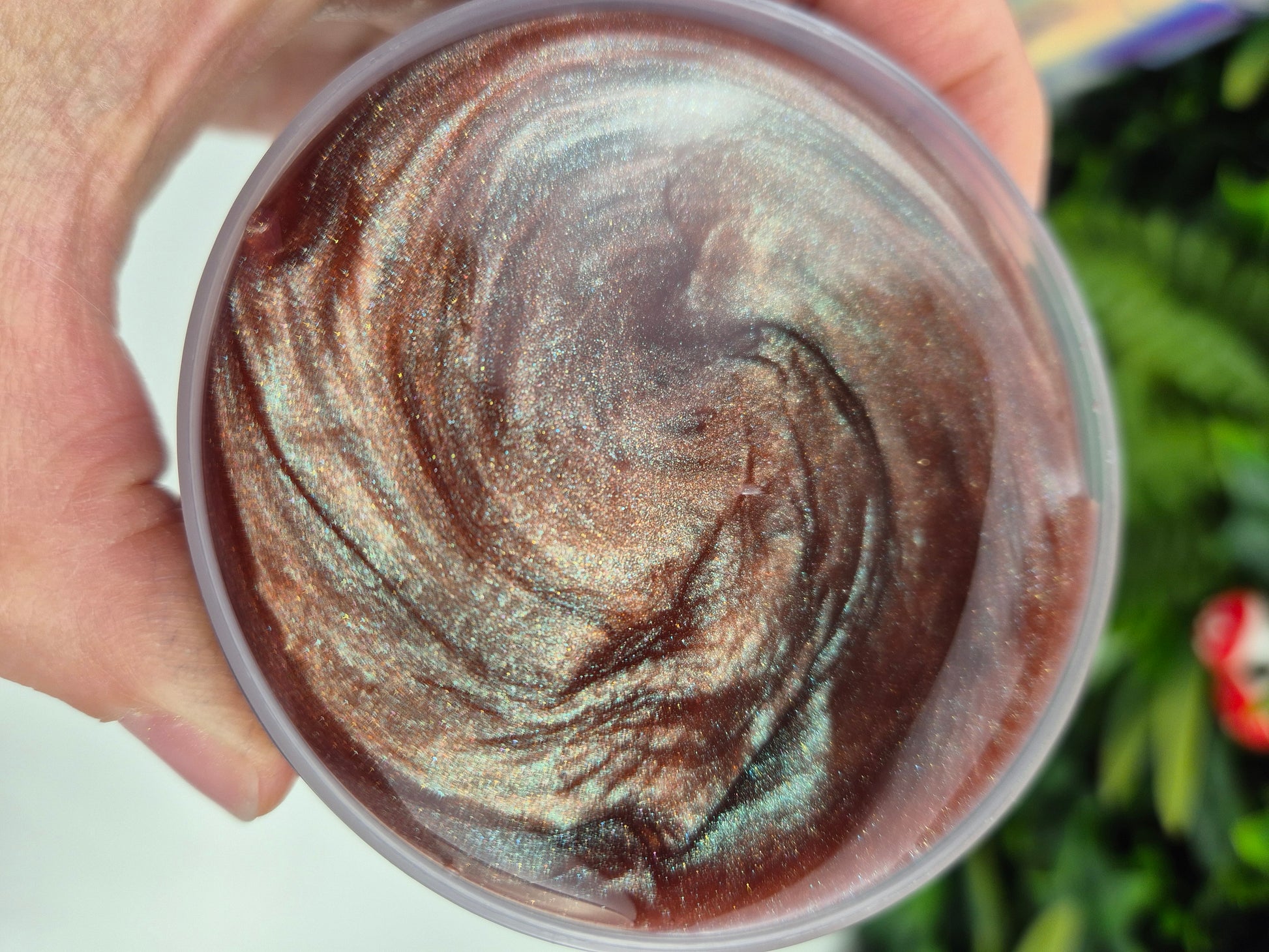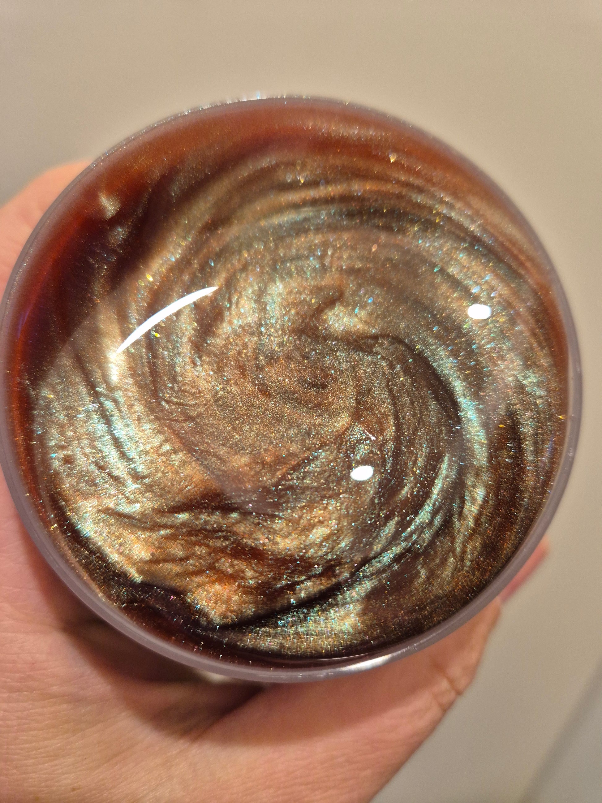 Description: A coated clear with super pretty chameleon colour shift pigment that changes from a deep red to green/gold.