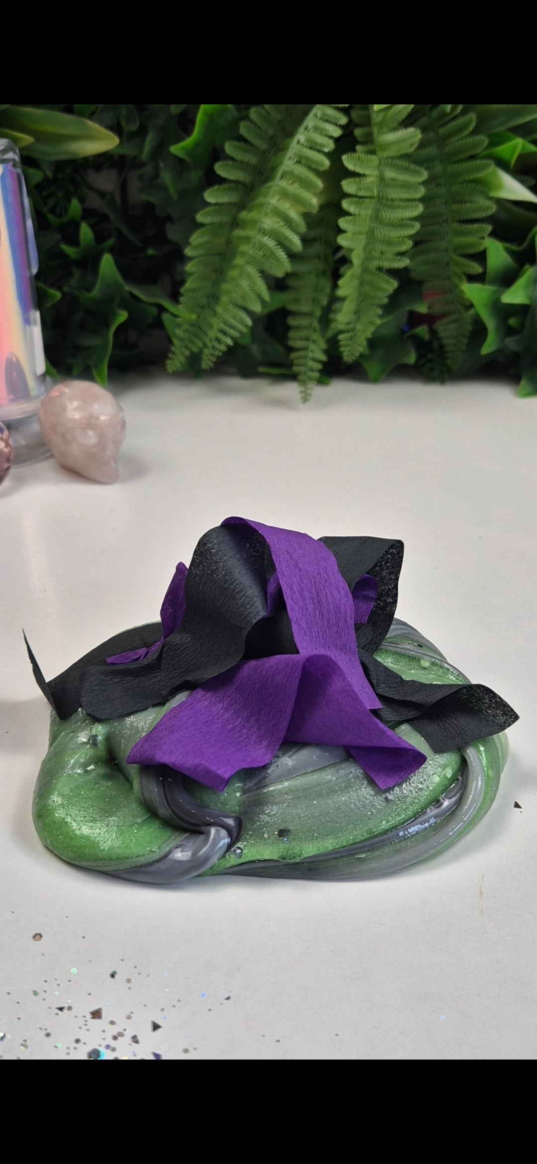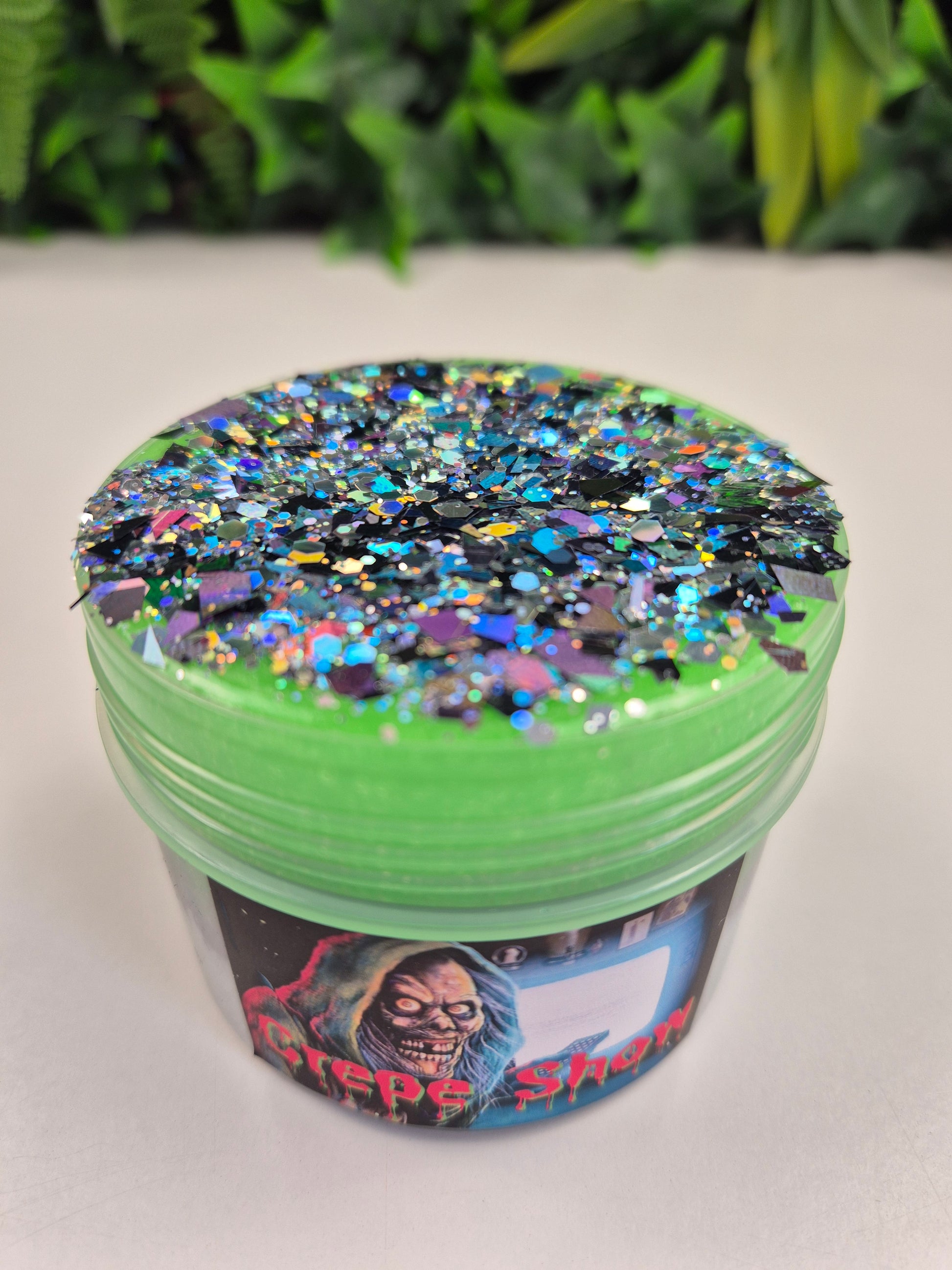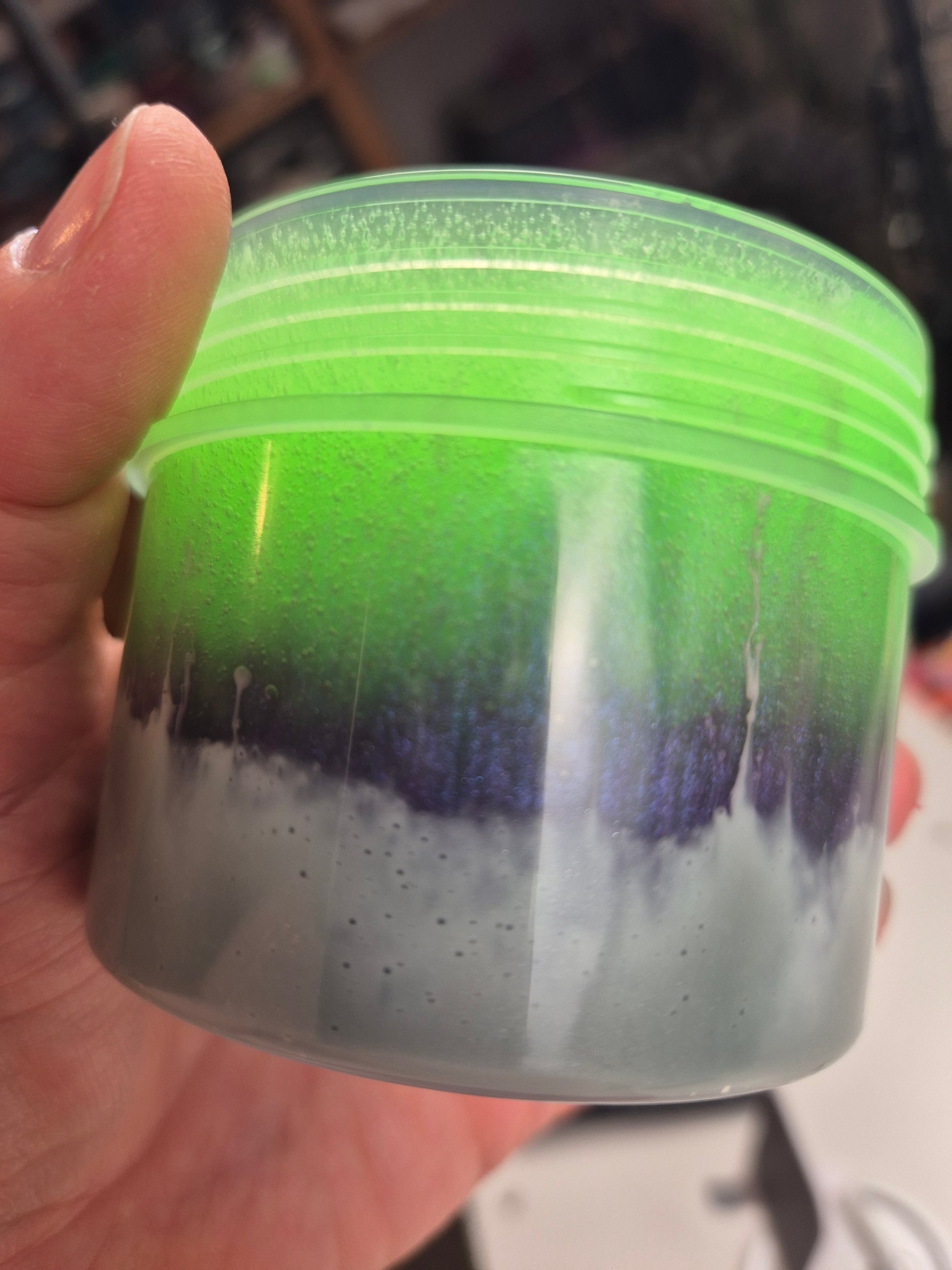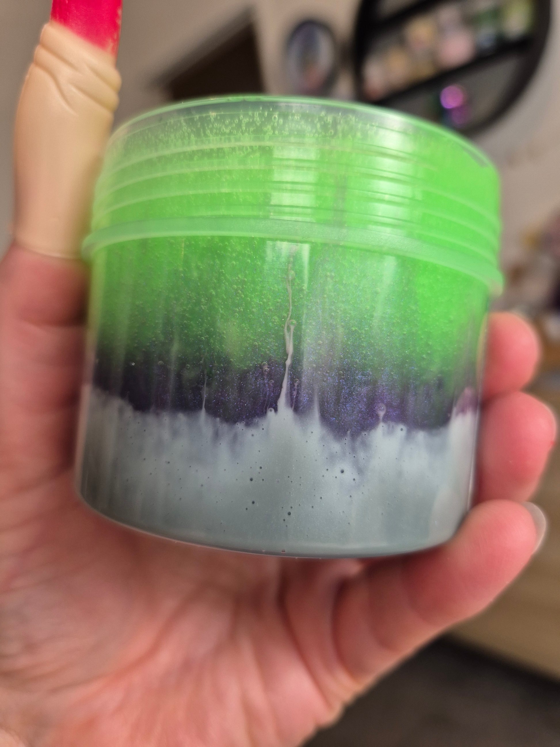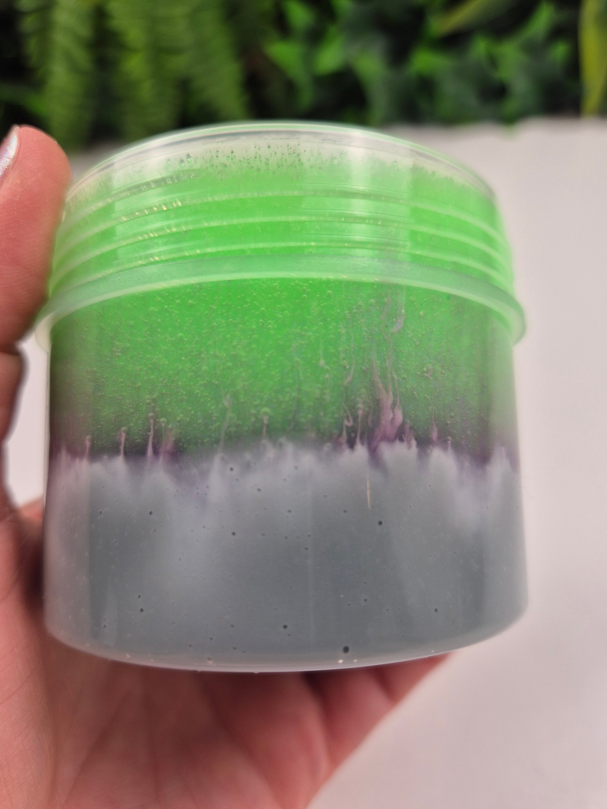 Description: An avalanche style slime with bottom layer grey thick n Glossy, top layer neon green coated jelly and a small layer in the middle of shimmery iridescent coated clear purple. Once all mixed in creates a white glue jelly texture. If you decide to add the crepe paper it will slowly dissolve into the slime creating yet another cool texture making it slightly chewier and elastic like.
