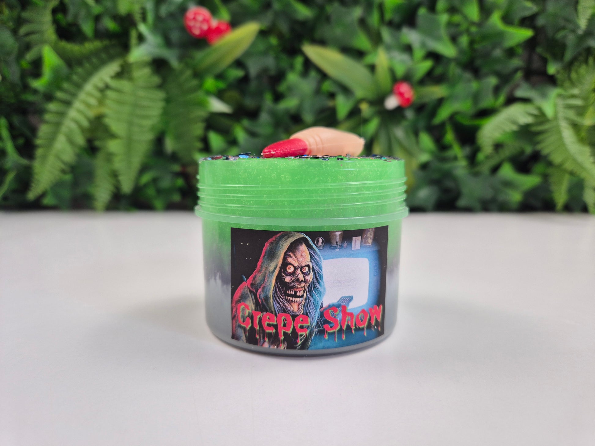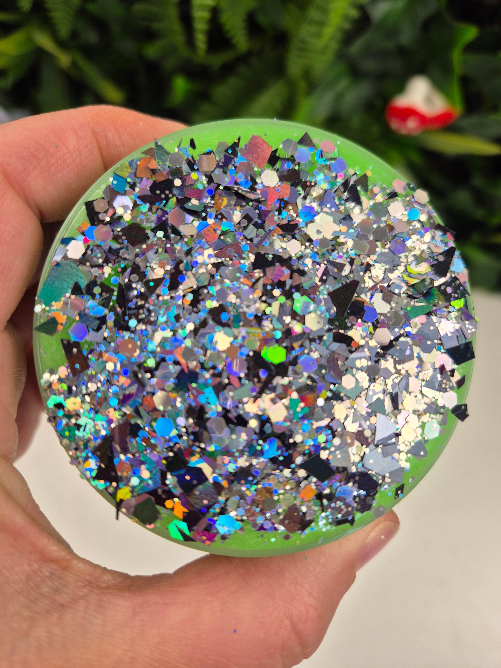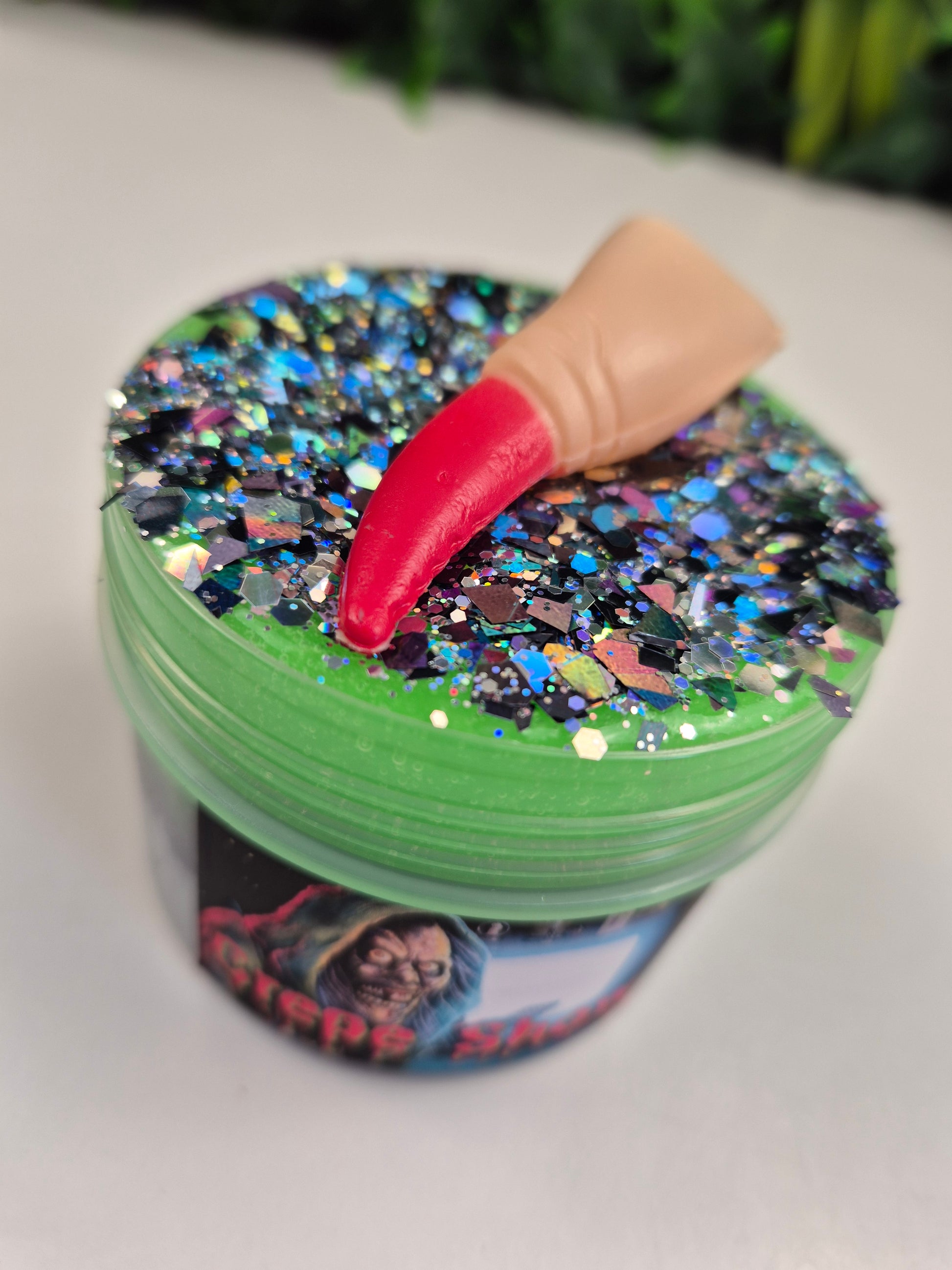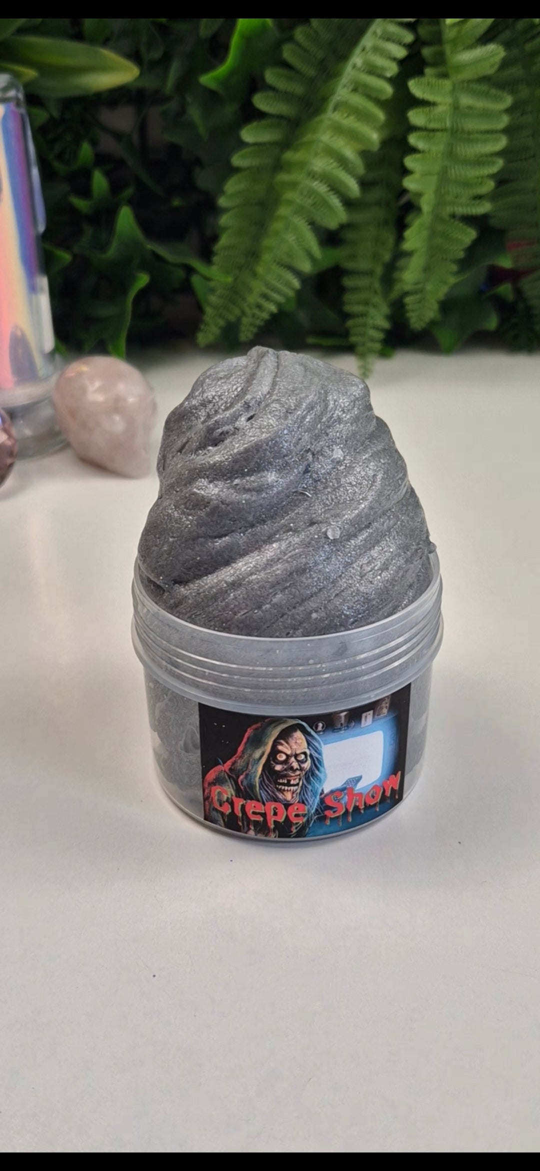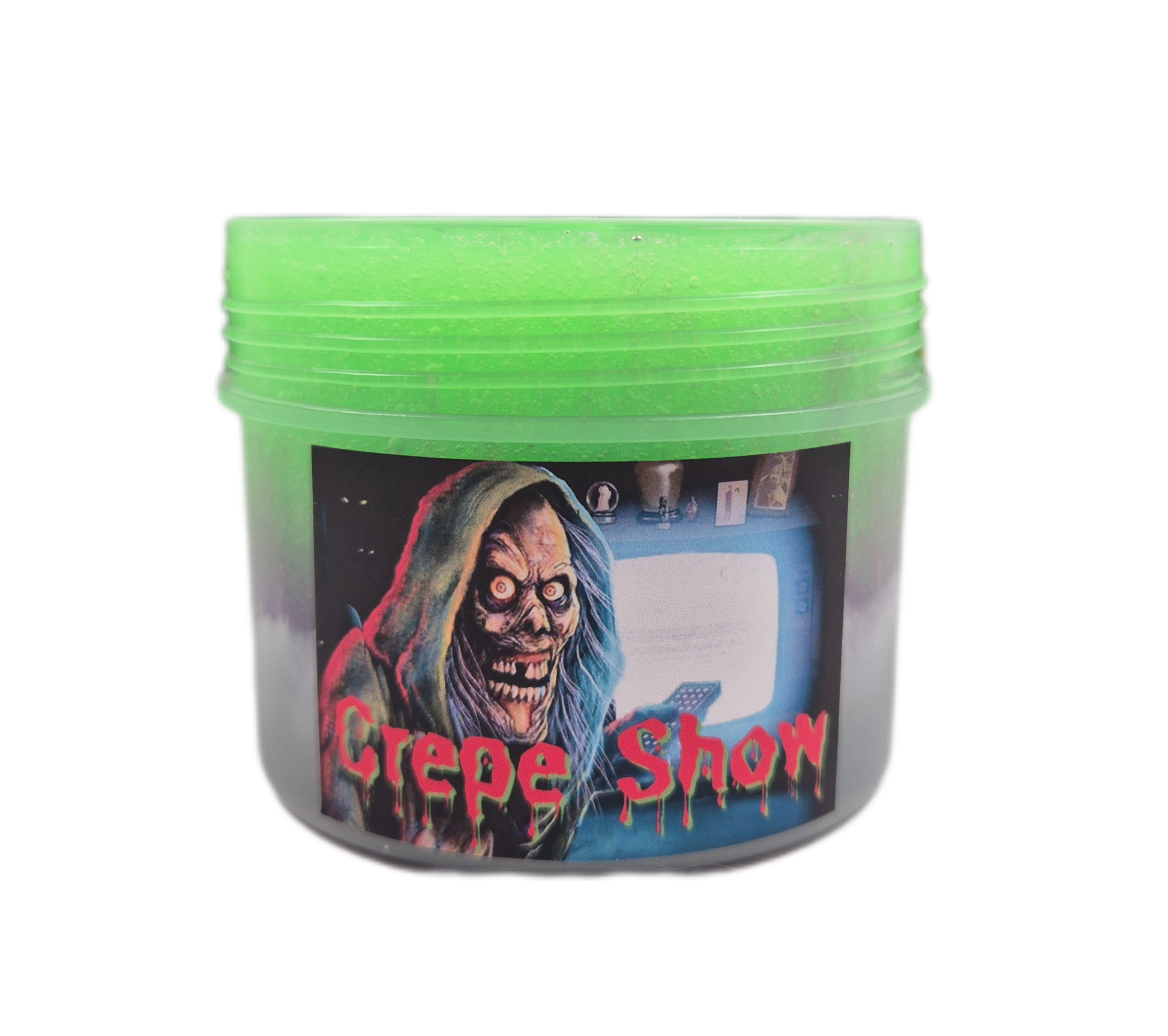 Description: An avalanche style slime with bottom layer grey thick n Glossy, top layer neon green coated jelly and a small layer in the middle of shimmery iridescent coated clear purple. Once all mixed in creates a white glue jelly texture. If you decide to add the crepe paper it will slowly dissolve into the slime creating yet another cool texture making it slightly chewier and elastic like.