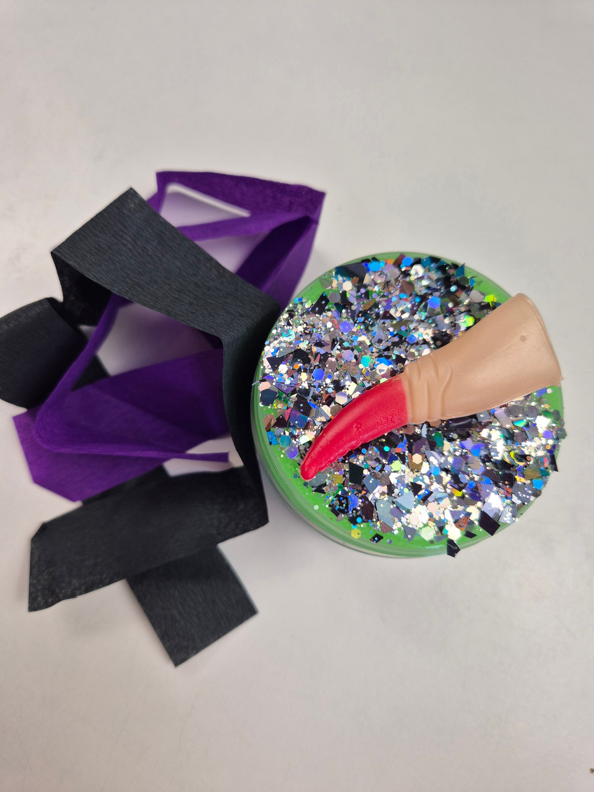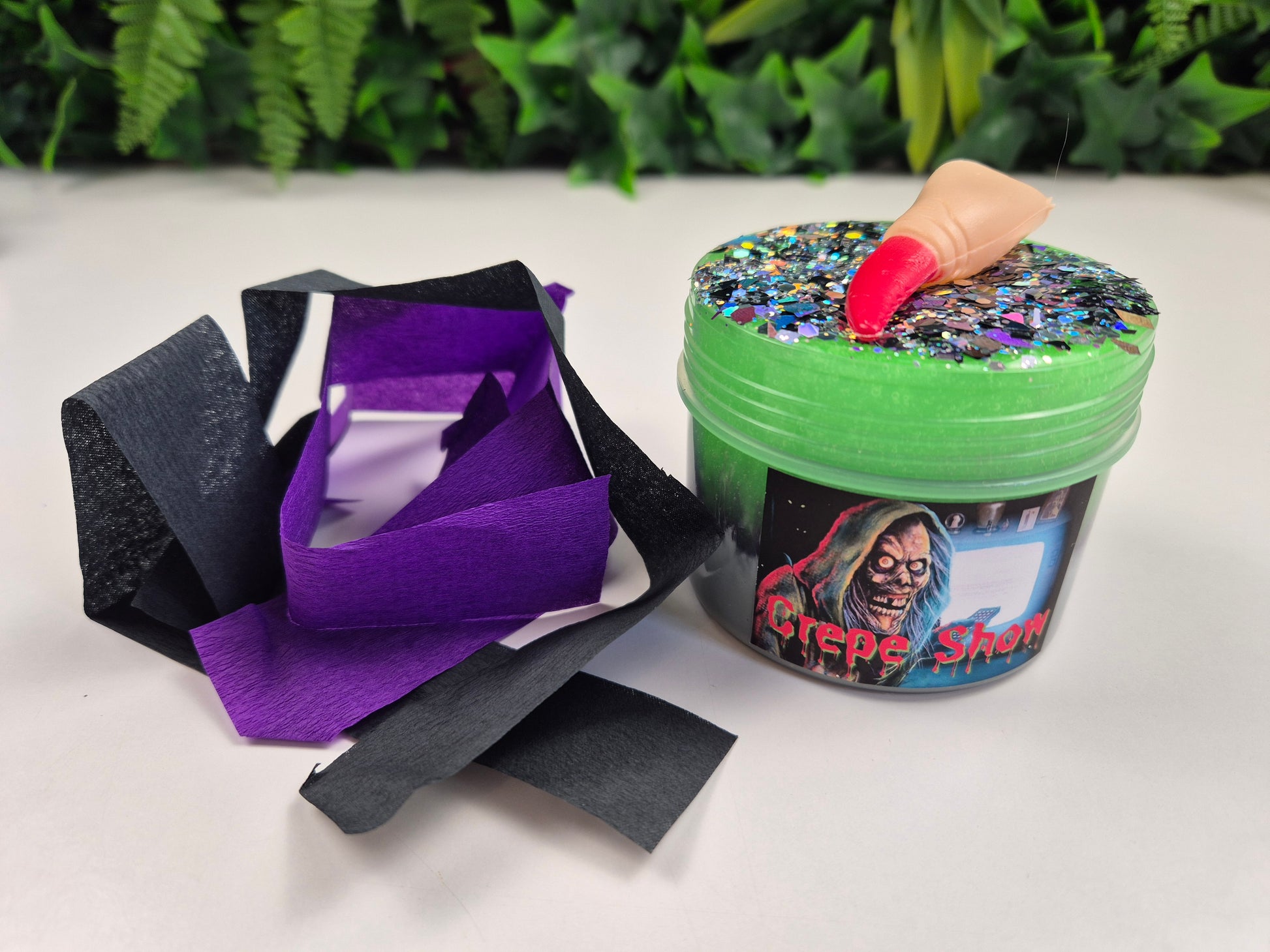 Included: Baggie of black and silver holographic glitter, Crepe Paper and Faux Finger toy (PLEASE NOTE, PURPLE CREPE PAPER WILL STAIN SURFACES. WASHES OFF HANDS EASILY BUT TAKES A BIT OF ELBOW GREASE TO GET OFF TABLES. I WILL INCLUDE MORE BLACK PAPER IF YOU CHOOSE NOT TO ADD THE PURPLE)