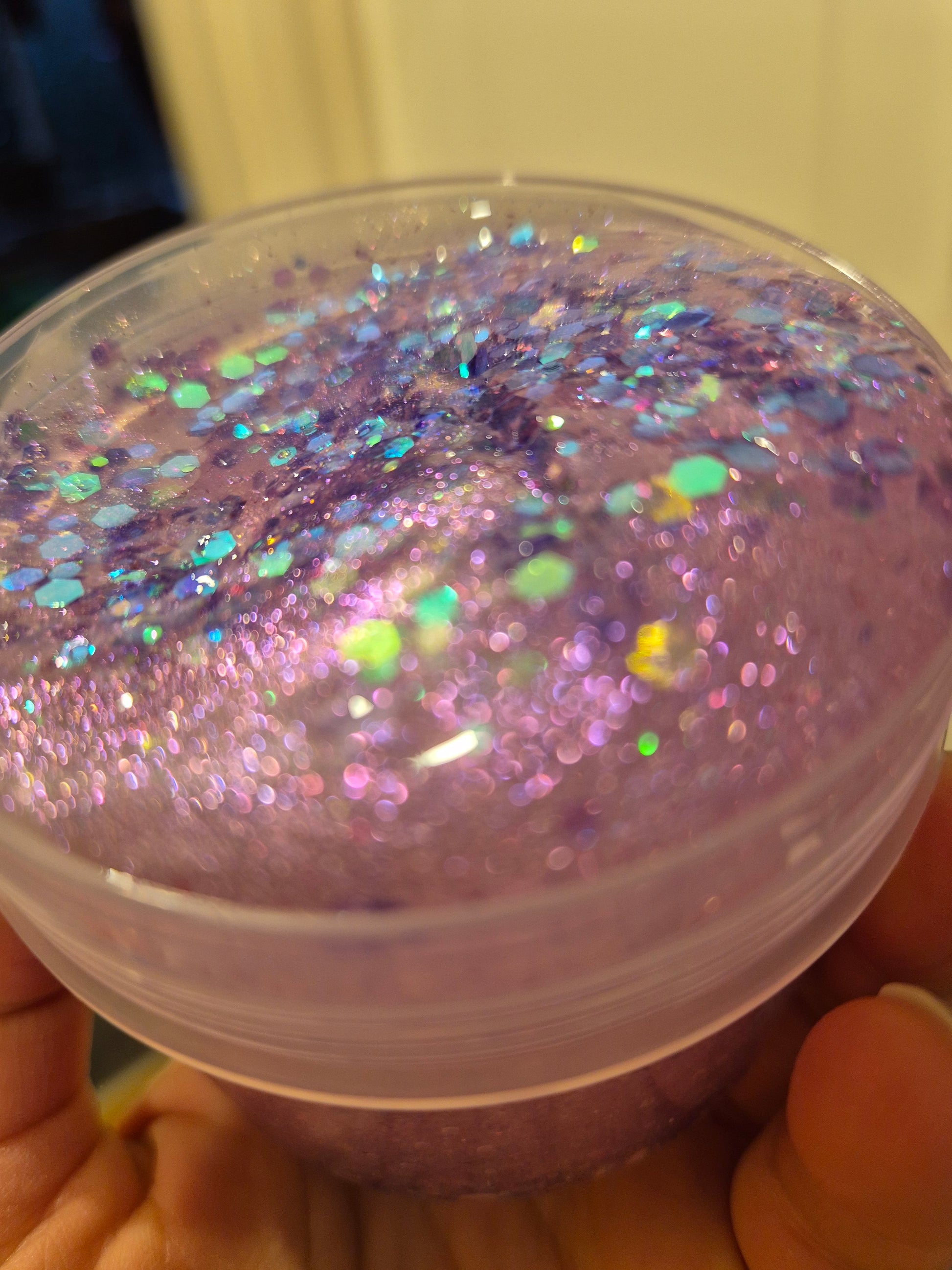 Description: A coated clear with pretty colour shift pigment and chameleon chunky glitters. Comes with the cutest mushroom charms and sprinkle mix to make your own faery ring and a metal faery wand charm. Make sure you don't leave the metal wand in the slime as it can corrode and rust over time.