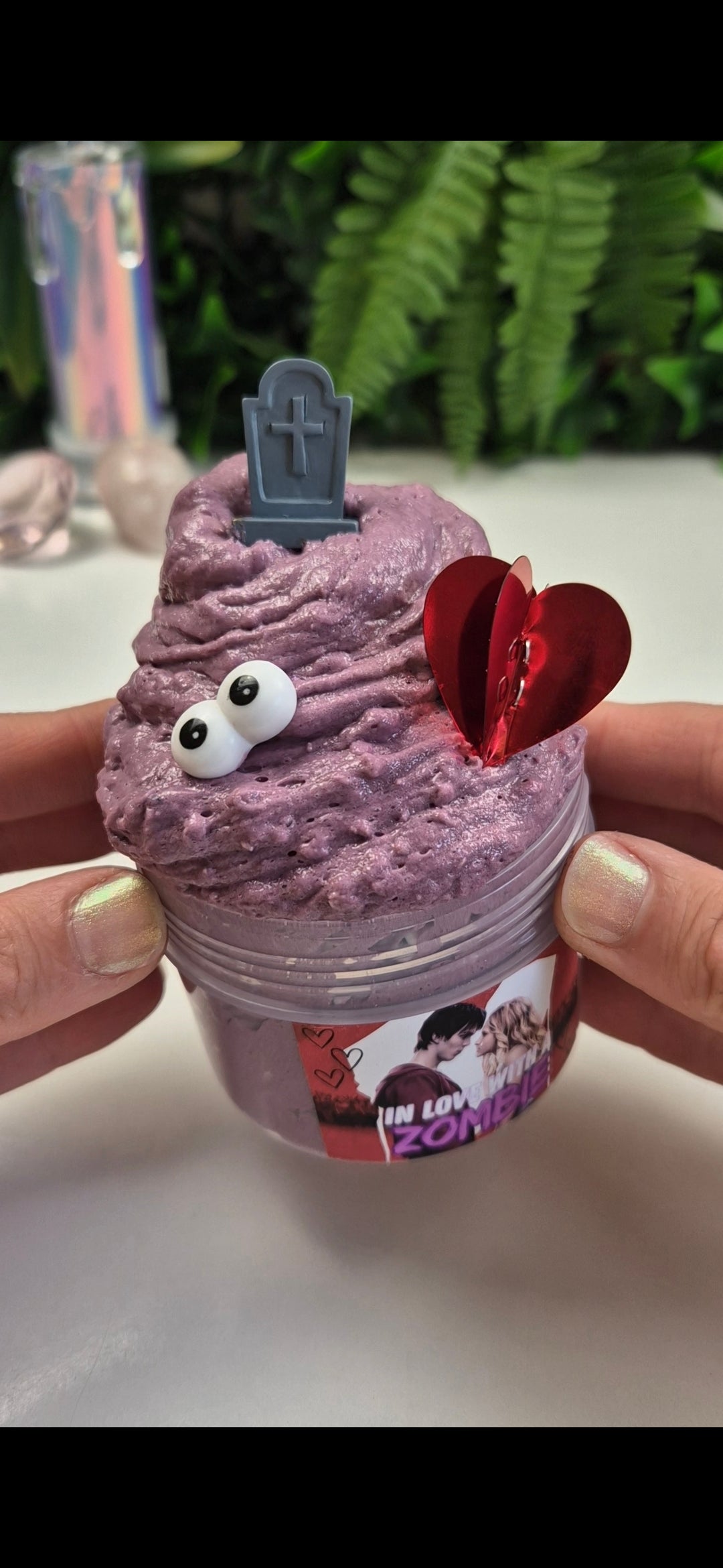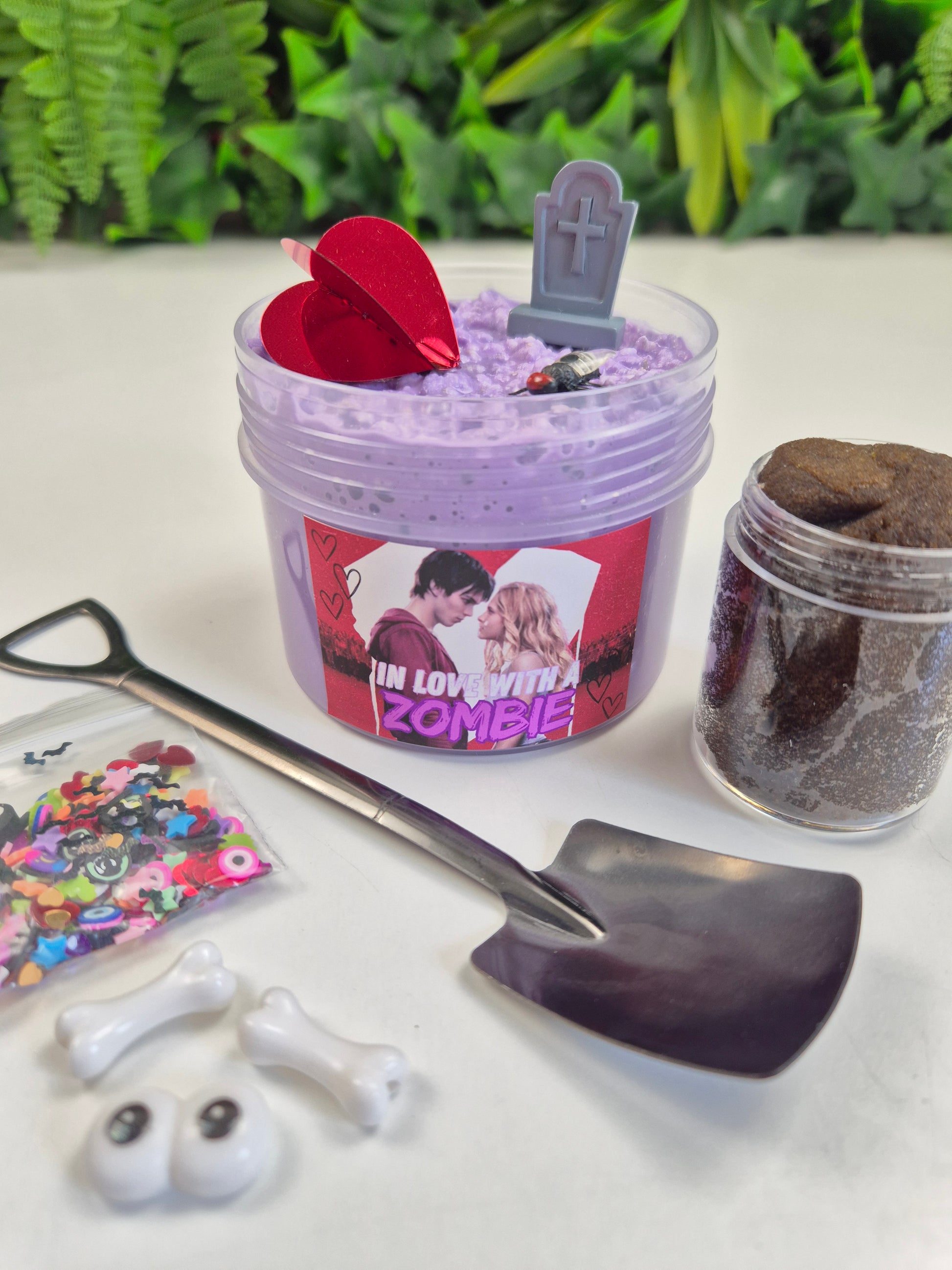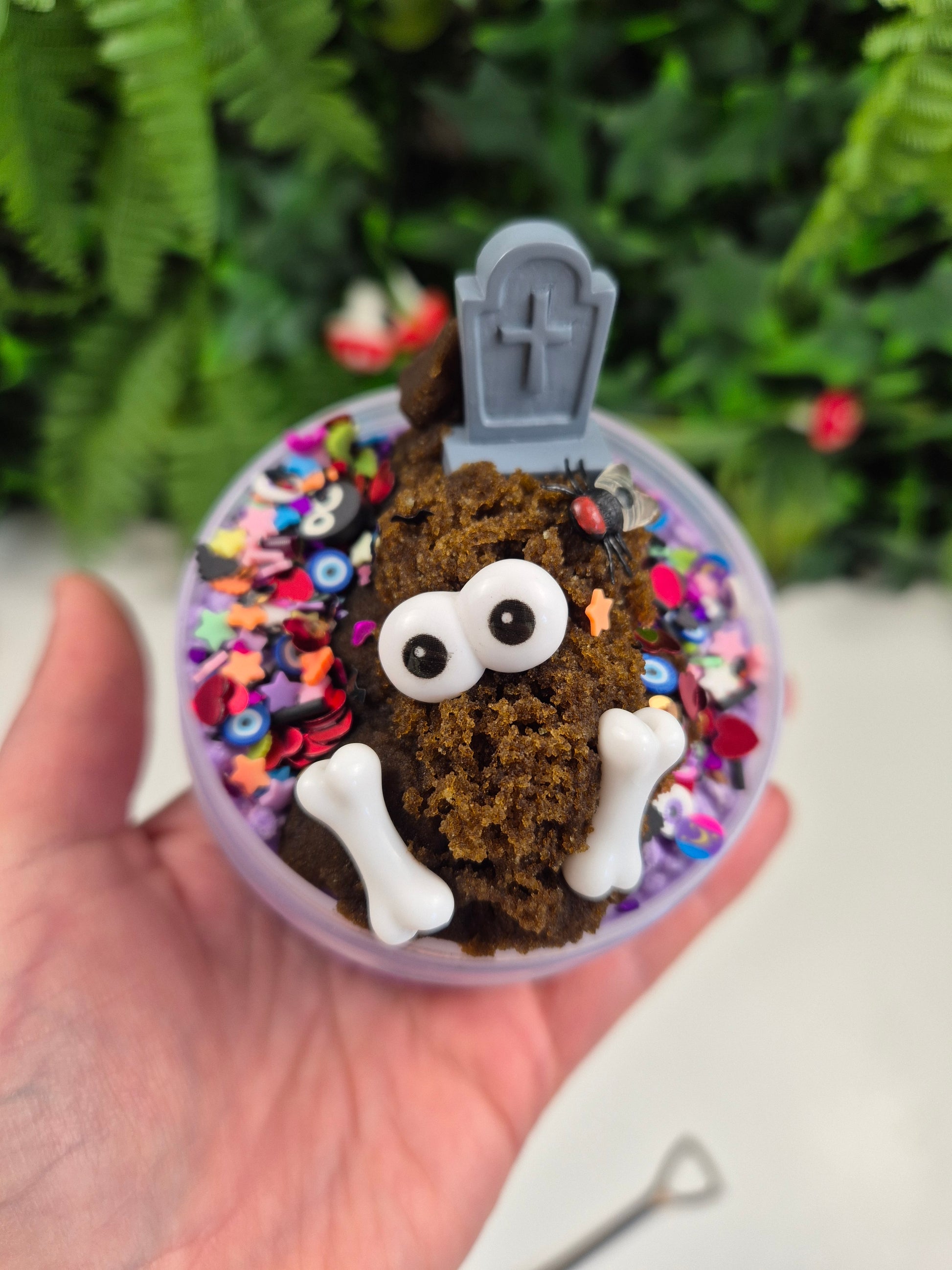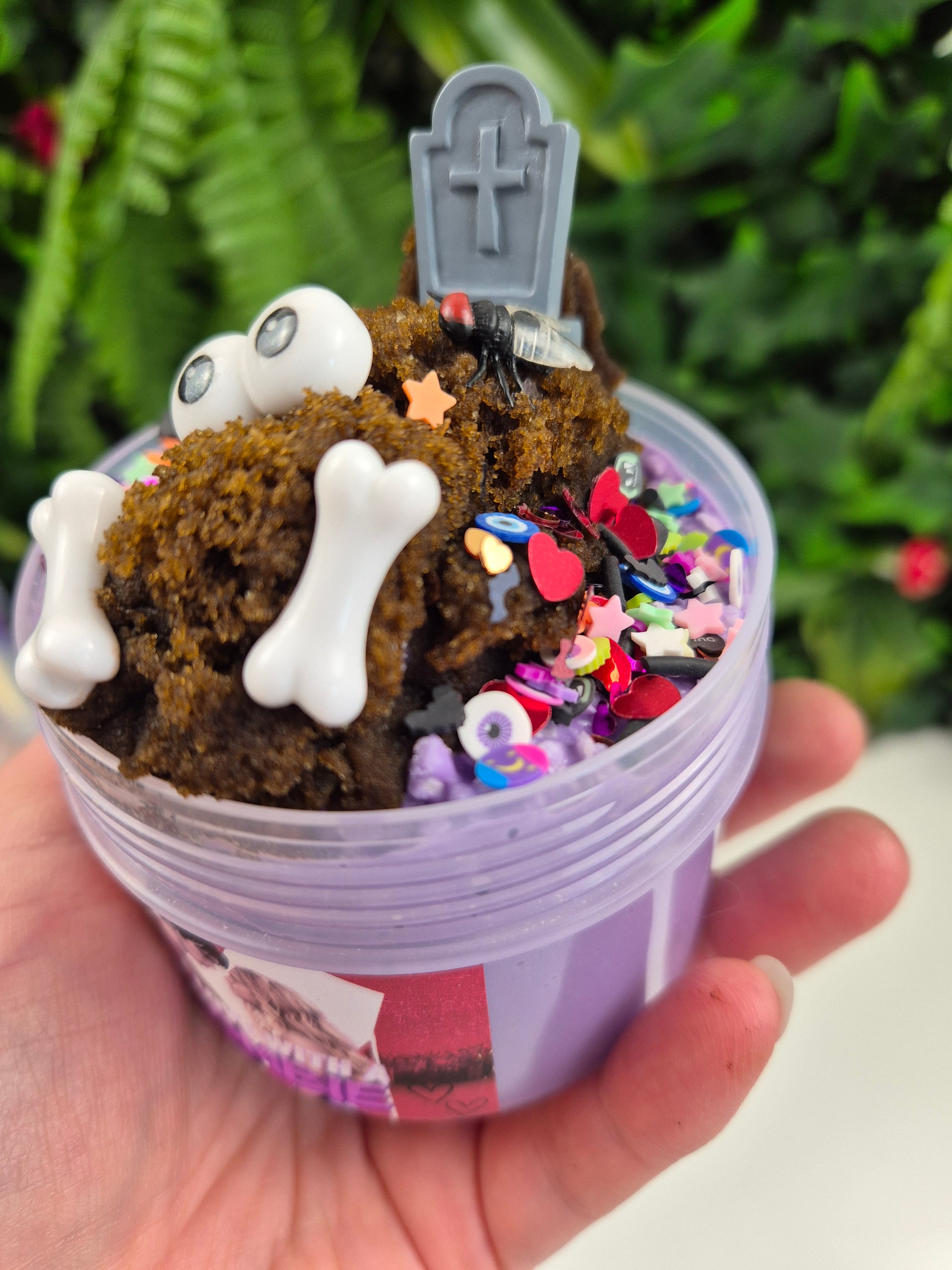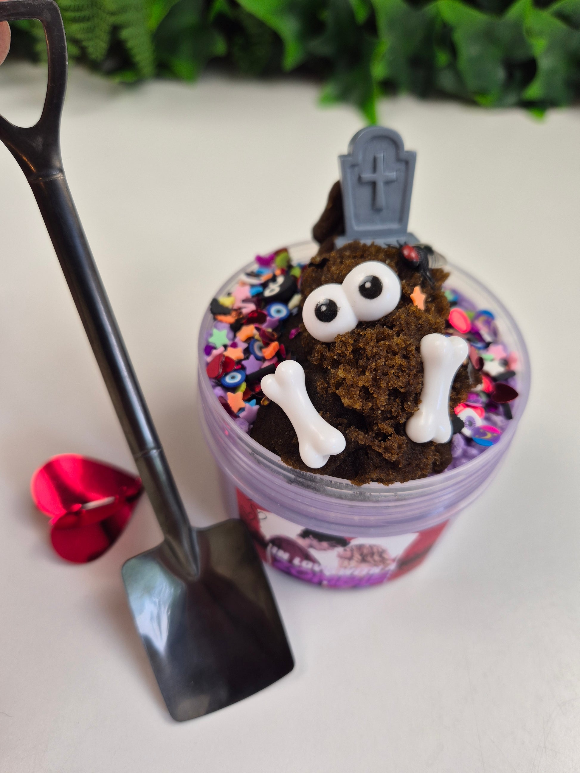 Description: This is such a fun slime to put together. Comes with the purple white glue perlite base and brown icee topper which imitates dirt. All you do is fluff up the icee and drizzle it into the shape of a grave and decorate how you like. The shovel spoon is bigger than I thought but I wanted a stronger metal shovel rather than the flimsy plastic ones I saw. So while the shovel is stainless steel it is a thinner and lighter steel but strong enough to dig up the slime grave and find your zombie crush waiting for you :P