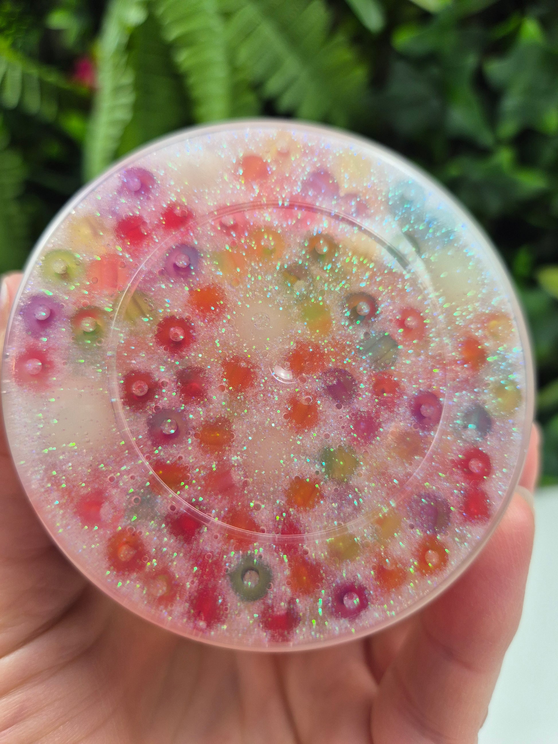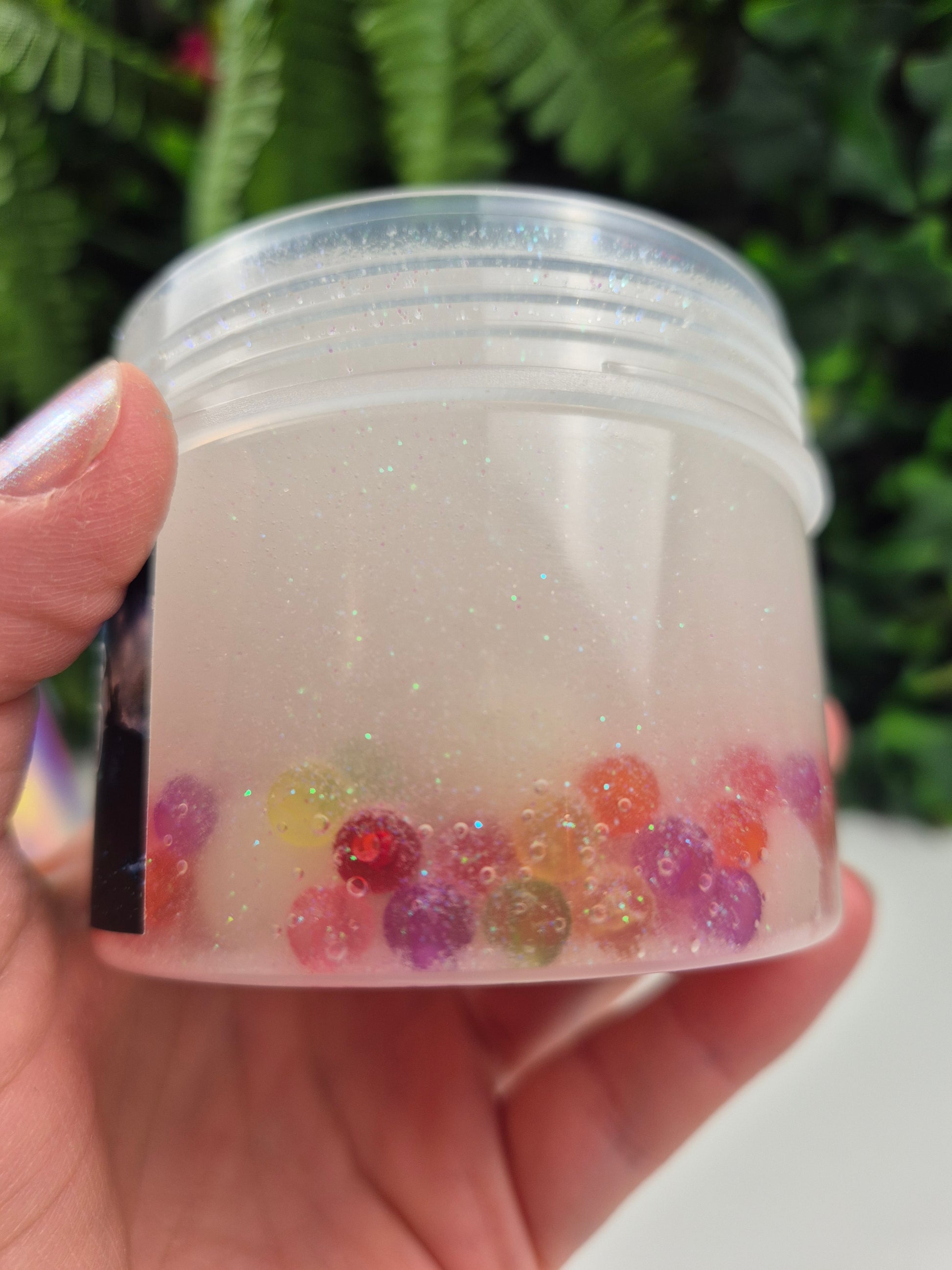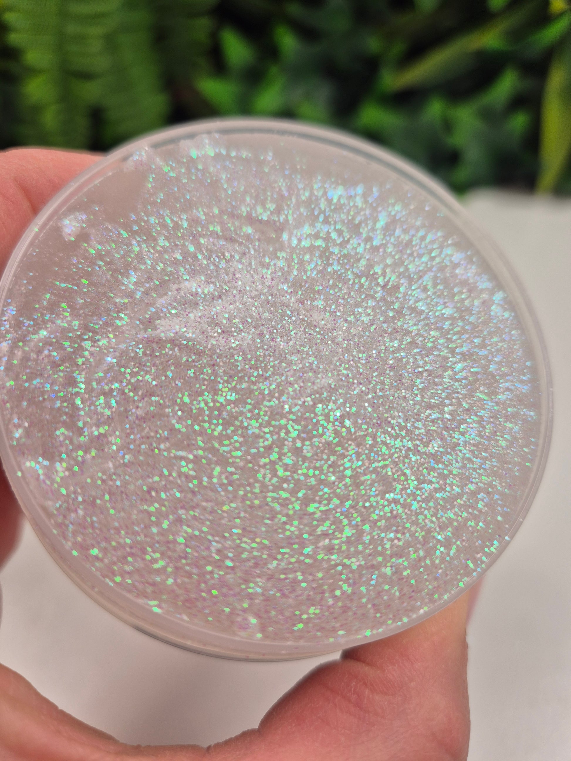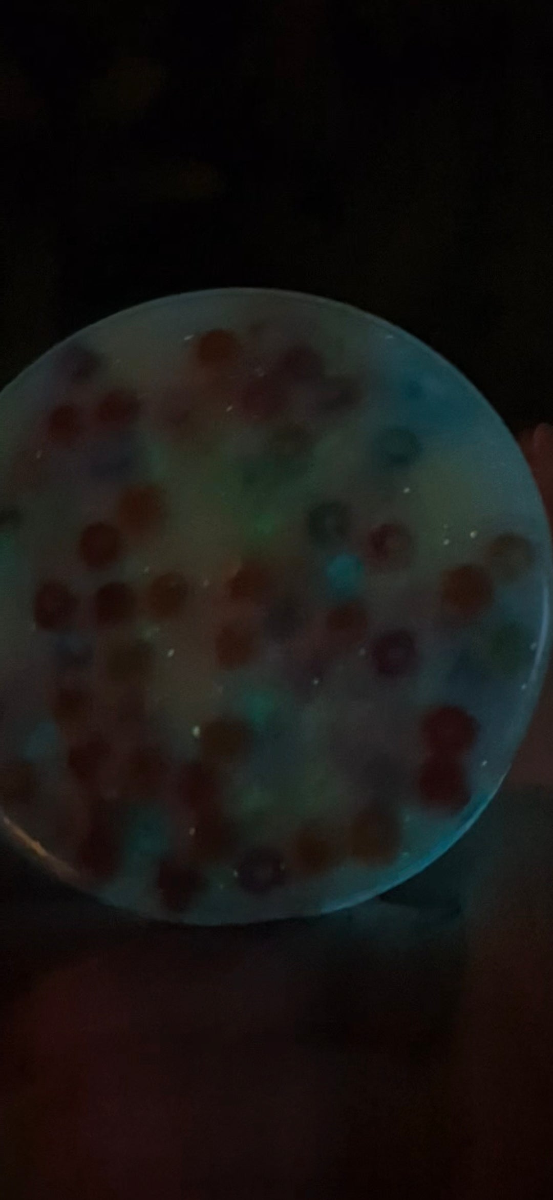 Description: A Coated dry Jelly which has a blue glow in the dark pigment through it (Best charged under the sun/UV light). It also has coloured frosted beads, smaller glow in the dark beads and some larger green glow in the dark beads thrown in there. It comes topped with iridescent glitter and the option to purchase a colour changing flashing light that you can place underneath the slime jar as per the pictures. I only have 5 flashing lights left so be quick if you want one!