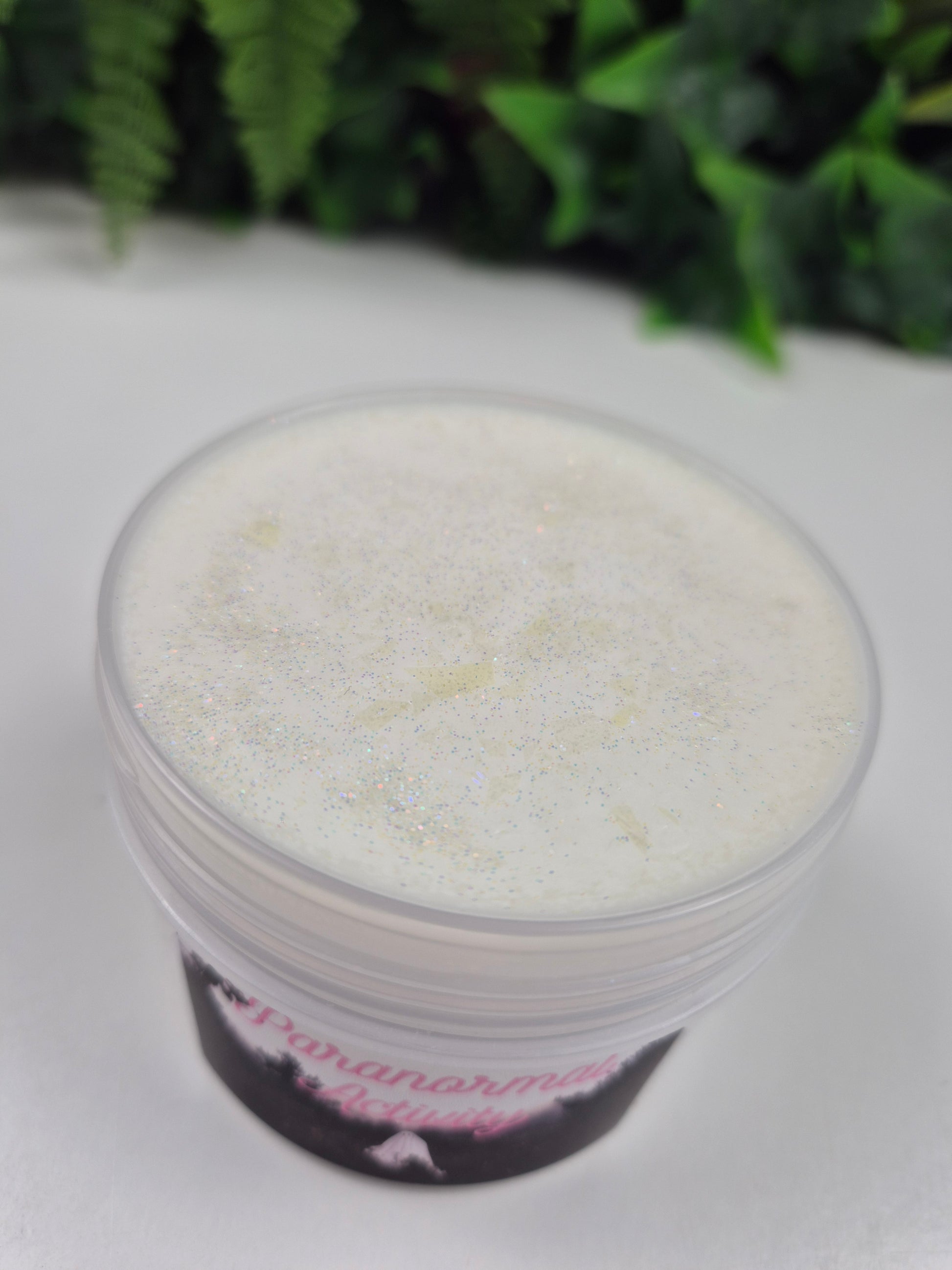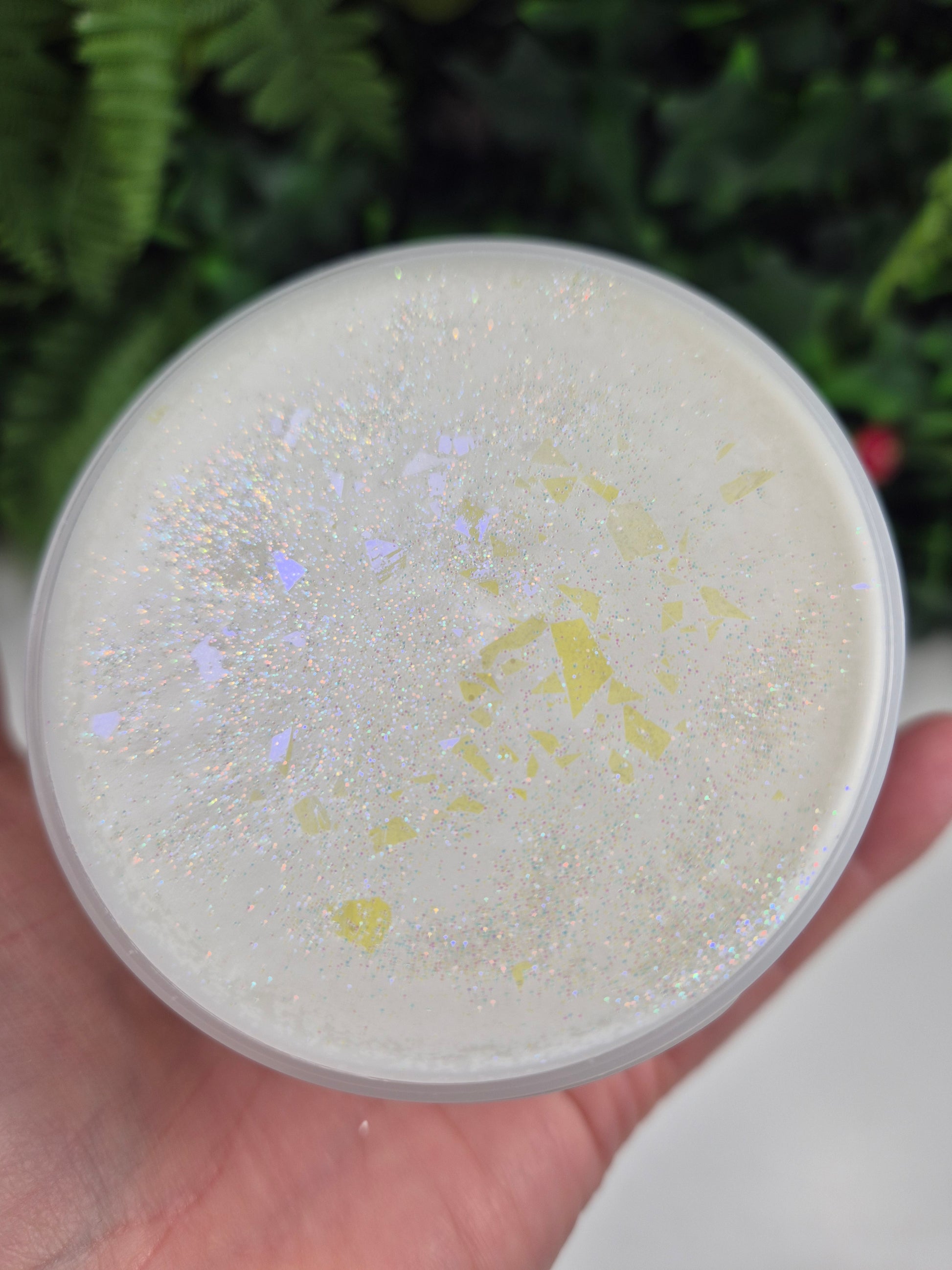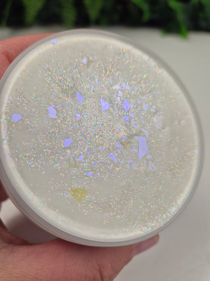 Description: This has to be one of my fave textures. It is a white glue snow fizz that has some instant snow in it which makes it extra creamy, soft and stretchy. If you tried Darrell's Easter egg slime then this is the same texture. It comes with a wax disc on top that you can crack open for that extra asmr factor. There is a sneaky charm hiding inside the slime which glows in the dark.