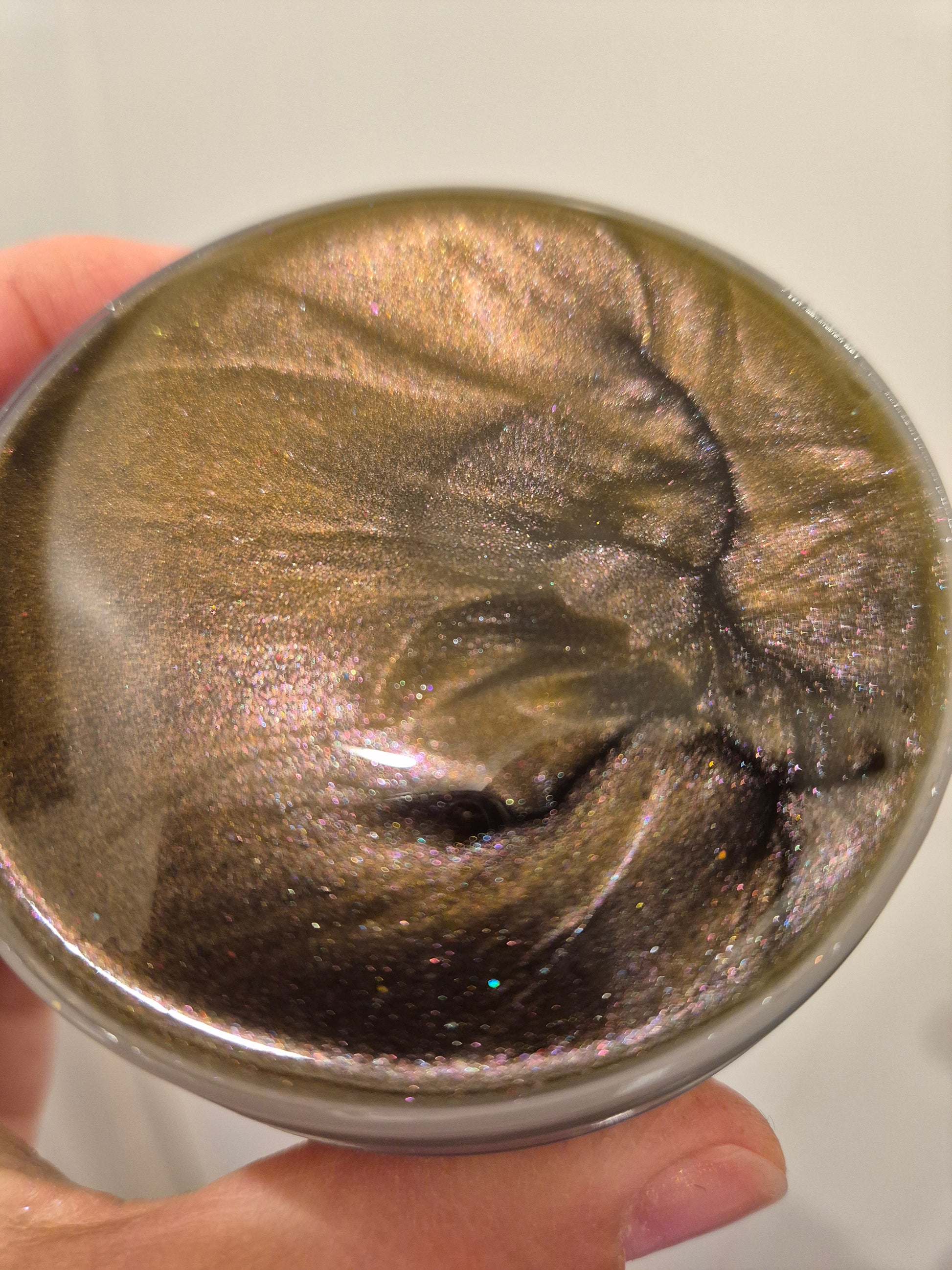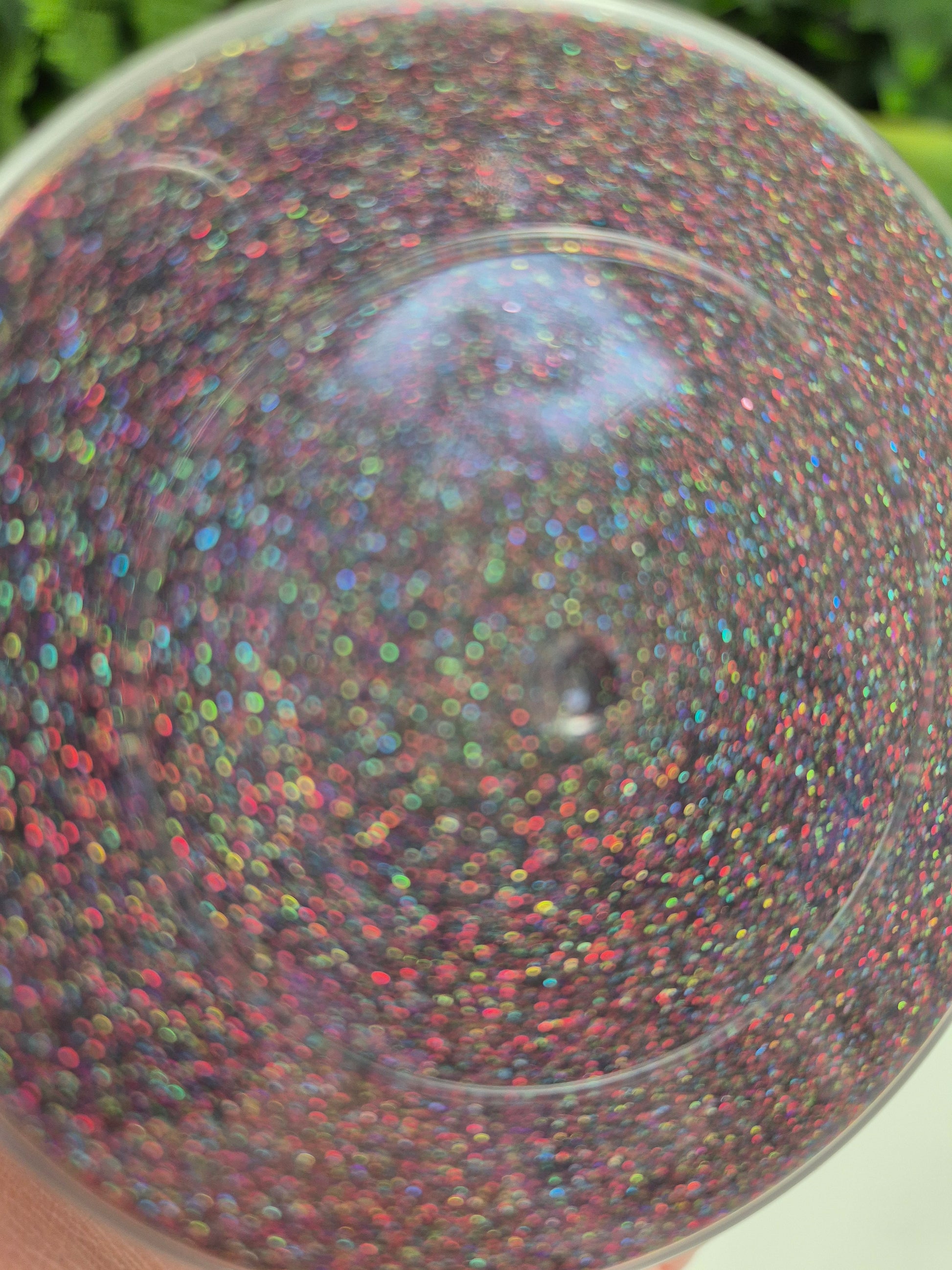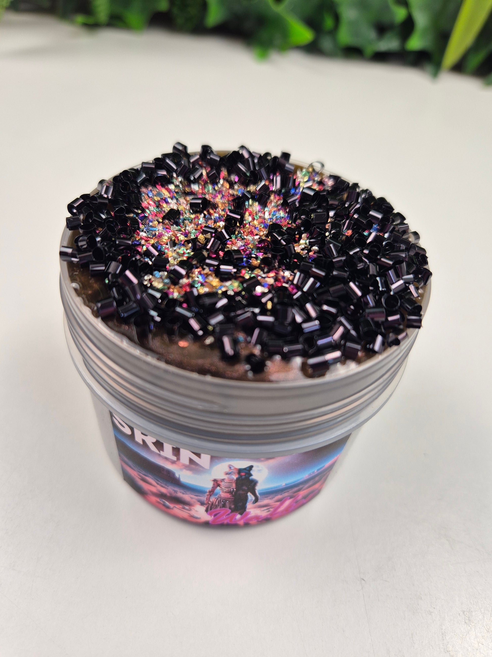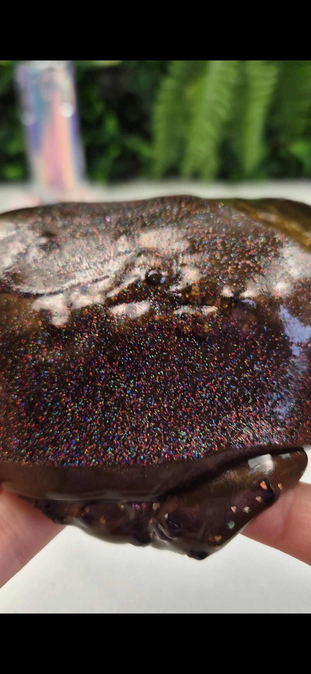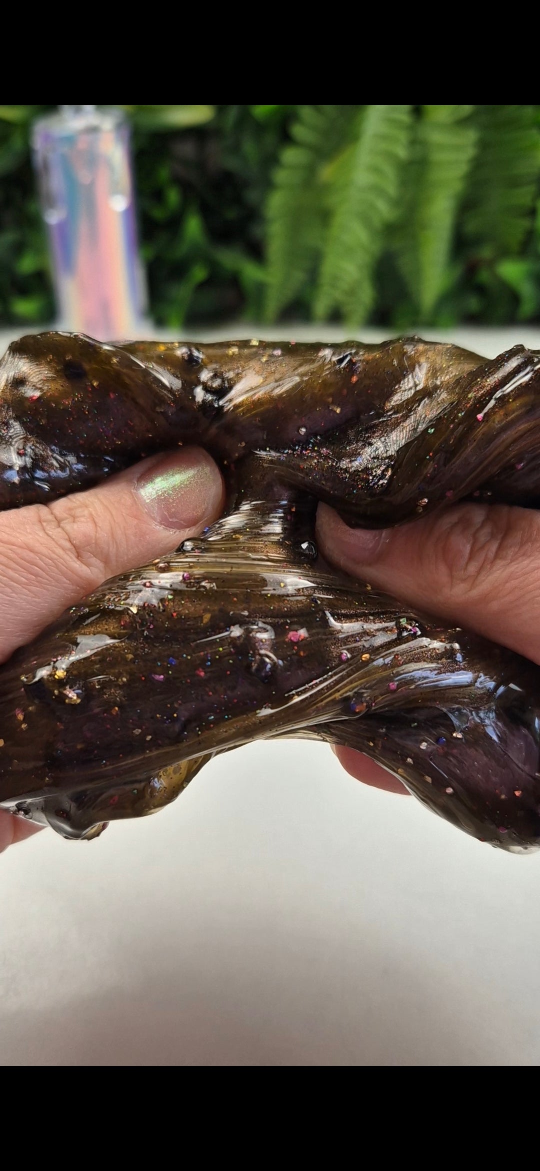 Description: A pretty coated clear that has a colour shift pigment running through it and rainbow micro glitters. The slime is a deep purple burgundy/cola brown and has golden undertones. Add the rainbow gravel and bingsu for some extra aesthetic and crunch. It doesn't change the texture too much as it is only a small amount but still enhances those pops.