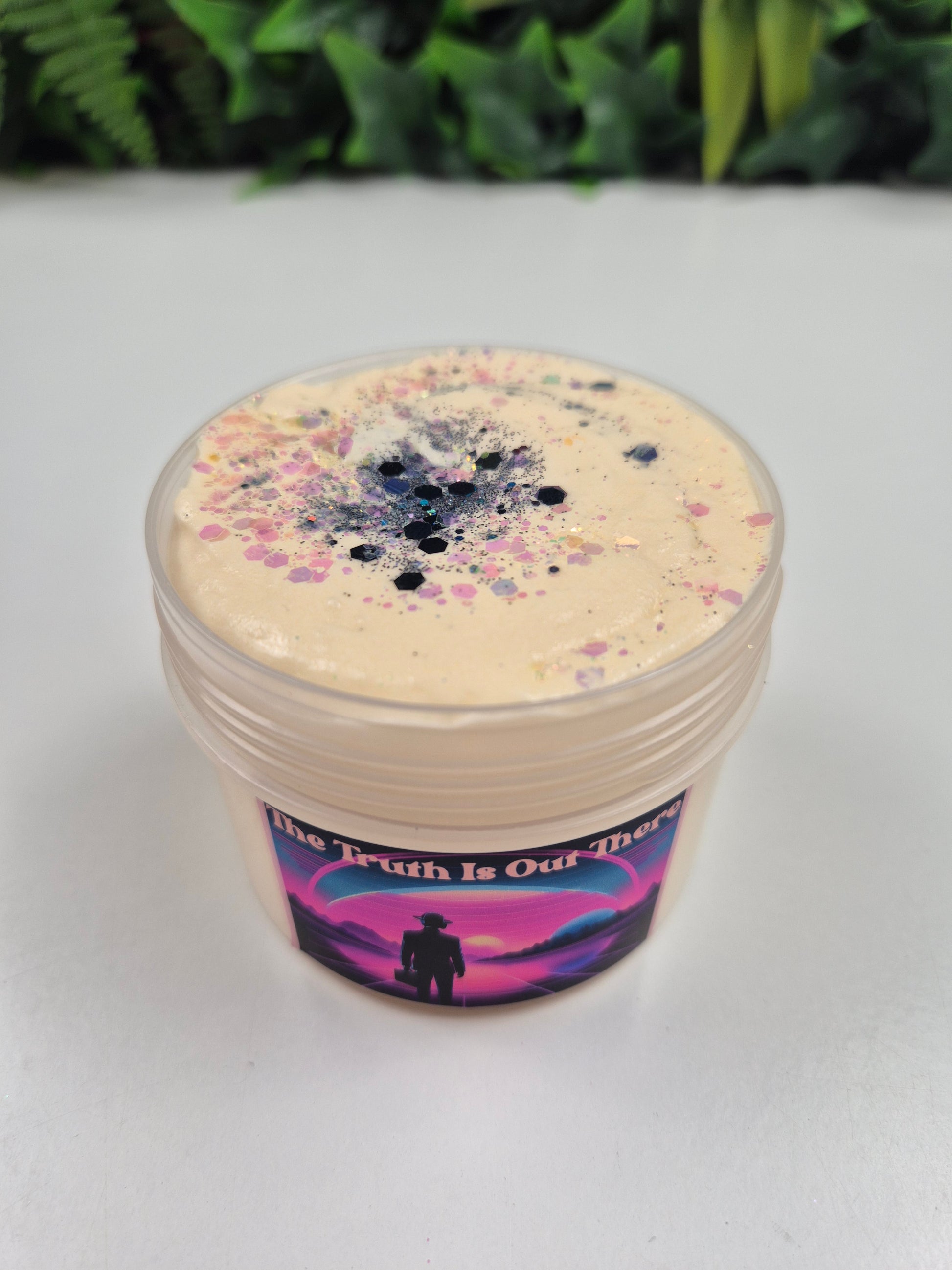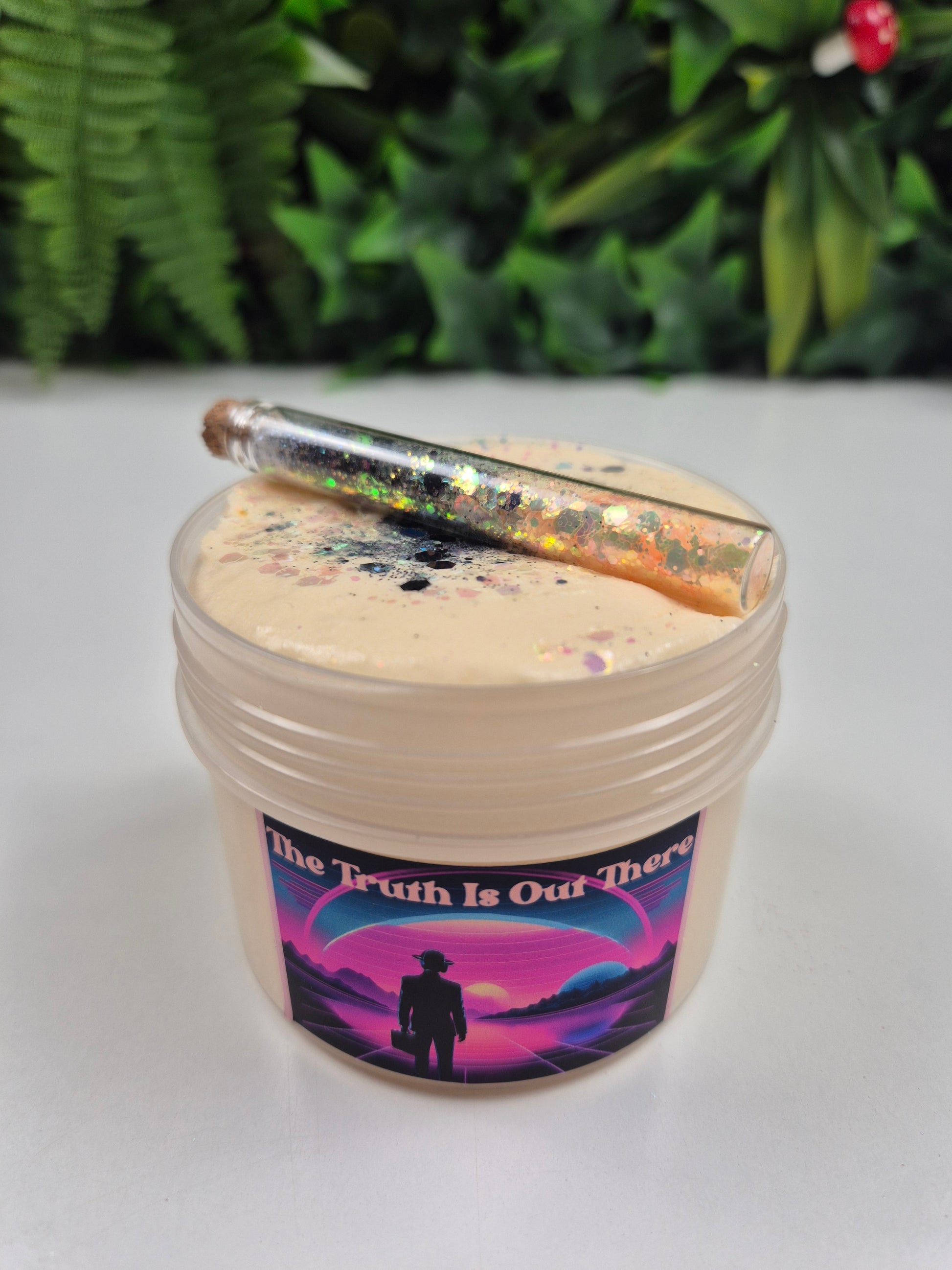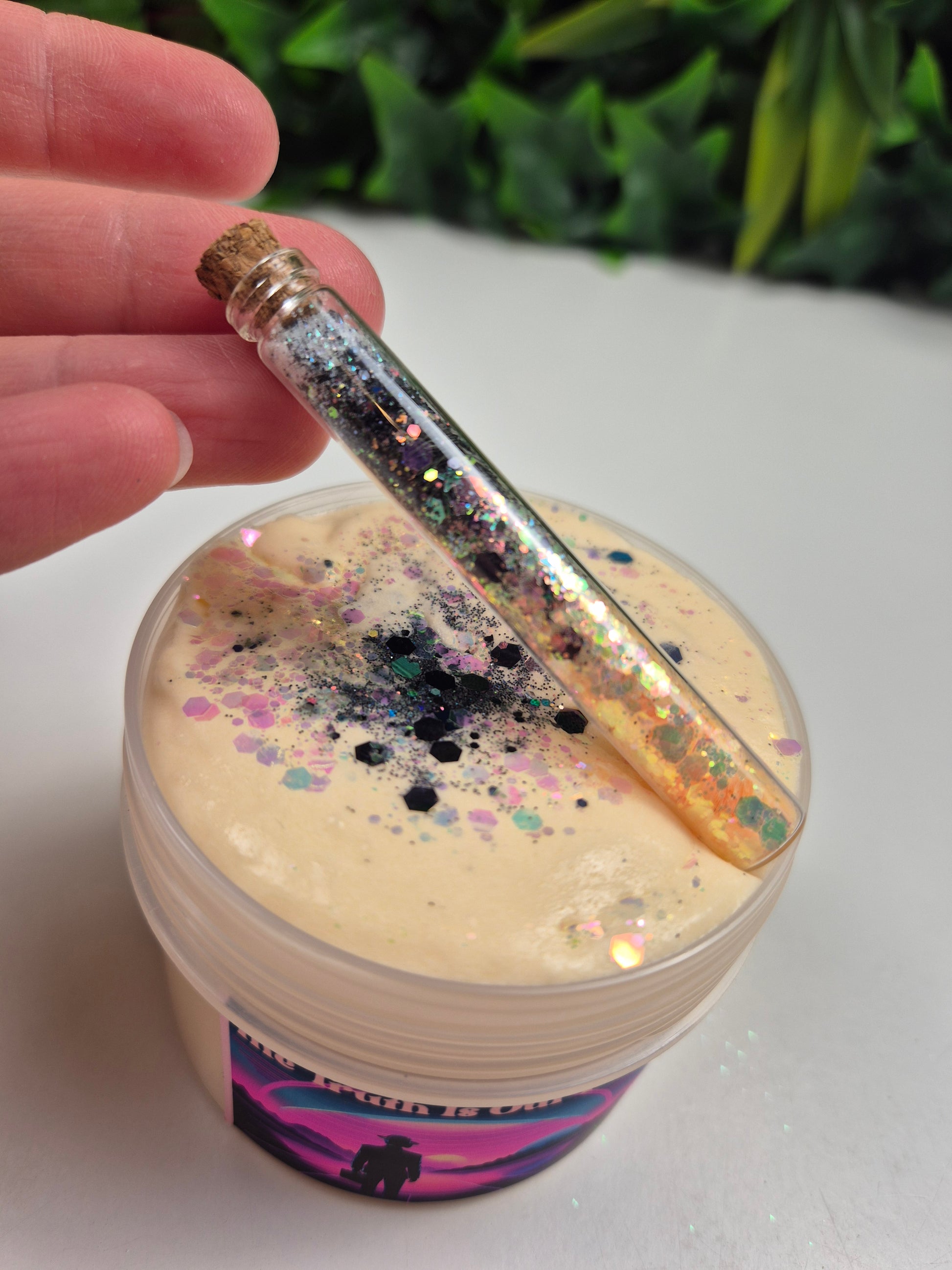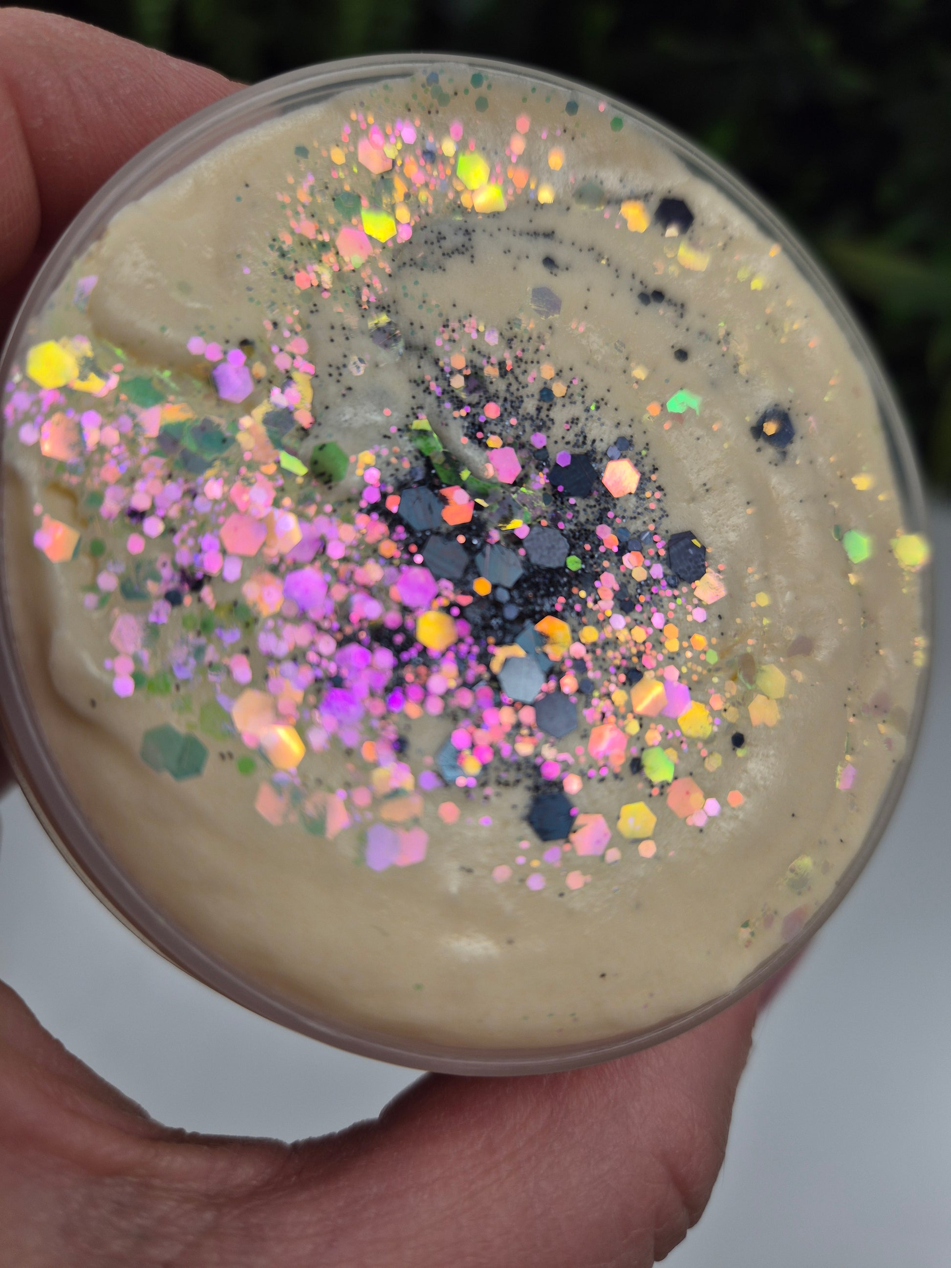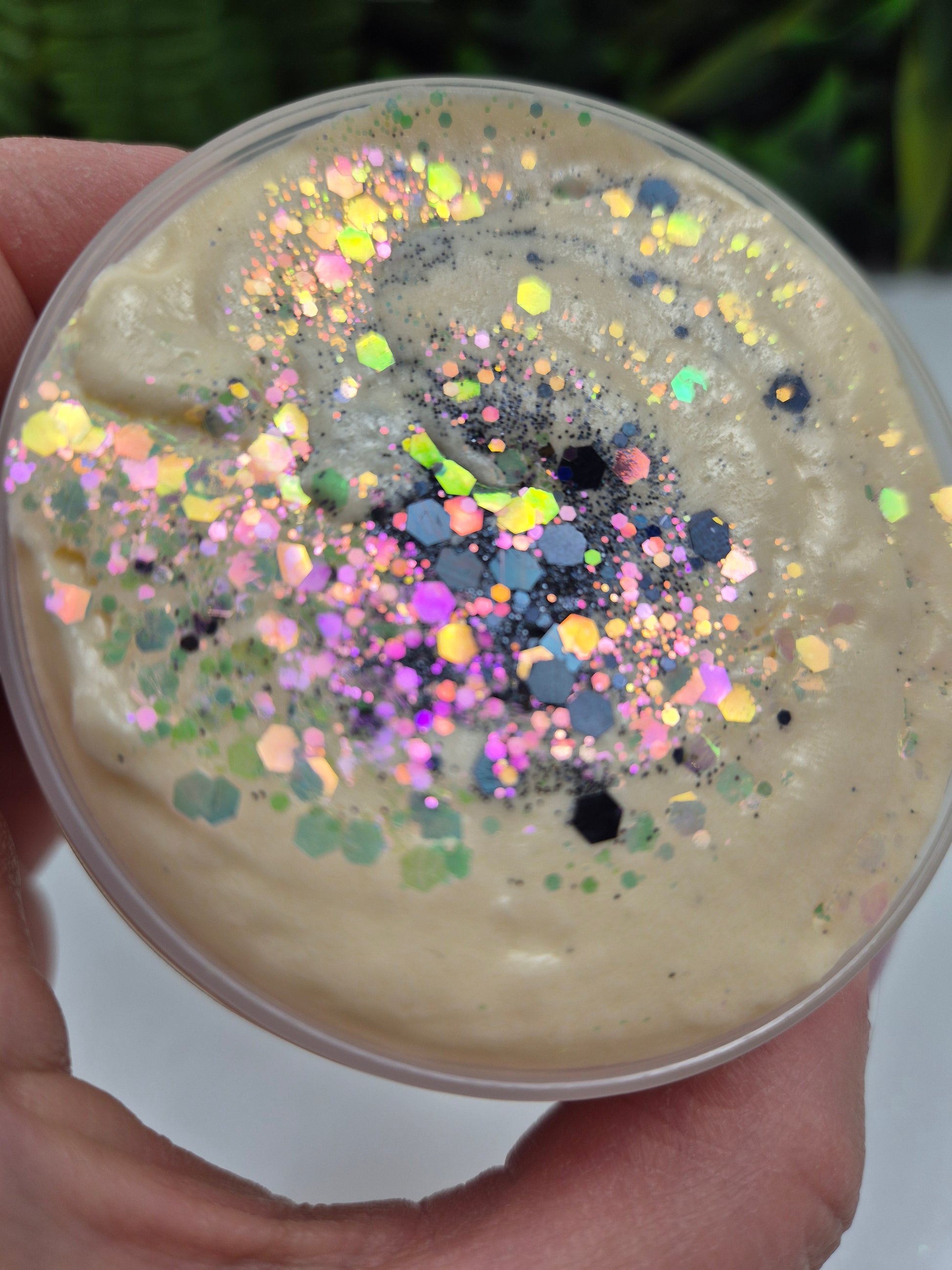 Description: A subtle peach coloured soft and creamy slime with instant snow and a little clay. This slime is creamy, dreamy and inflating. It will come with a super magical glass vile filled with Hidden Knowledge and pretty chameleon, iridescent and black glitters which you can choose to pour onto the slime or keep as a charm. The slime will come with a sprinkle of glitter on the bottom and top anyway. Be sure not to get the cork on the top of the vile in the slime as the slime will not come off unless you use a water and white vinegar mix.