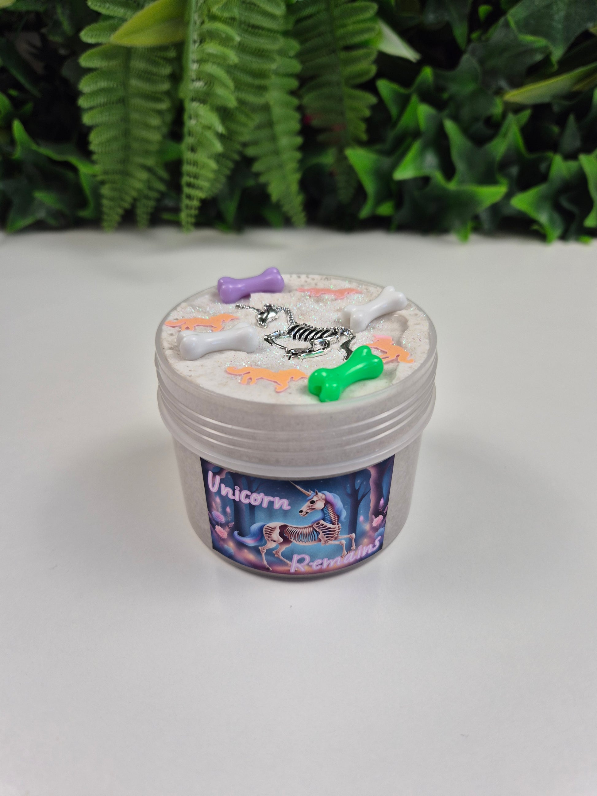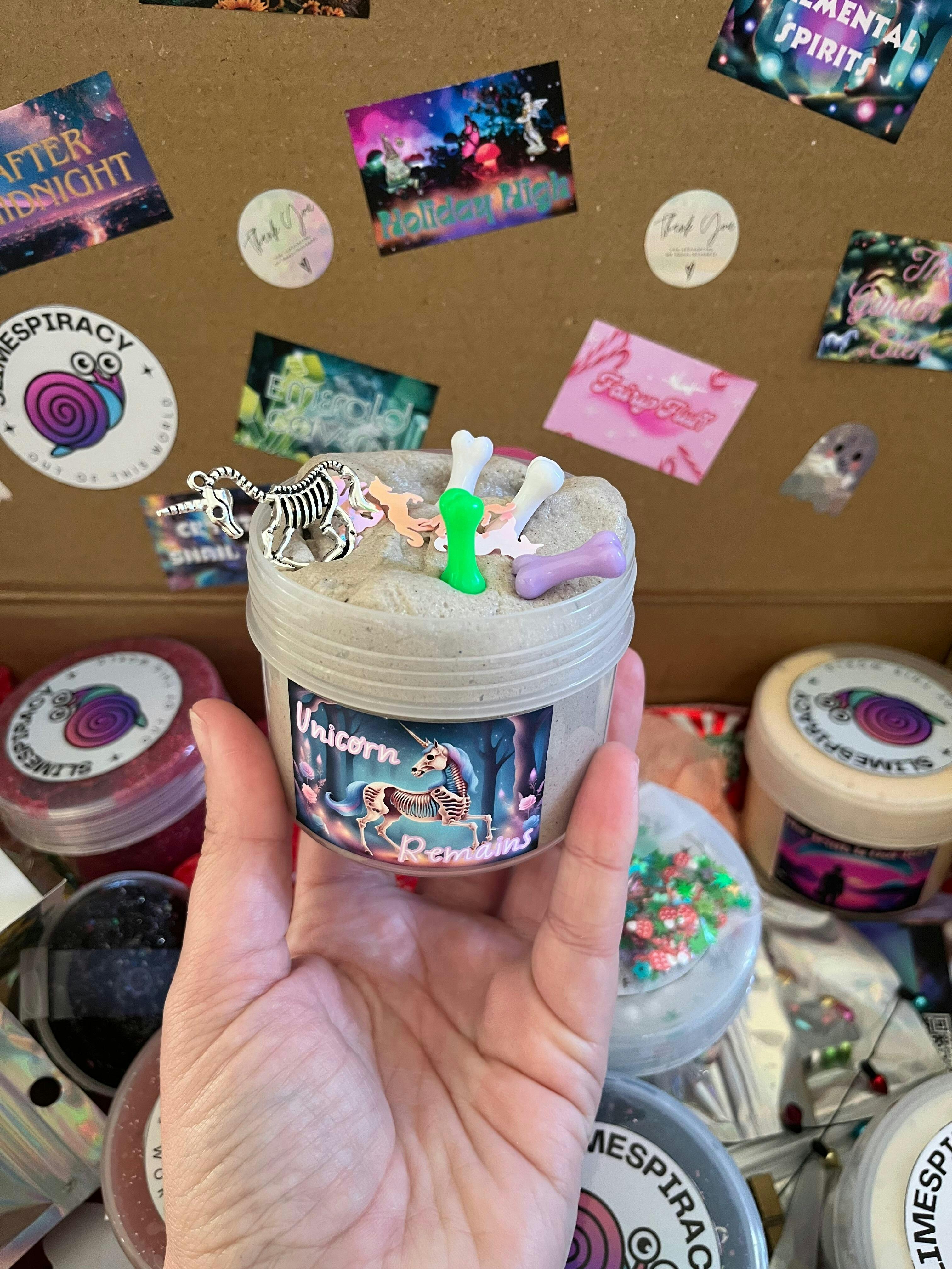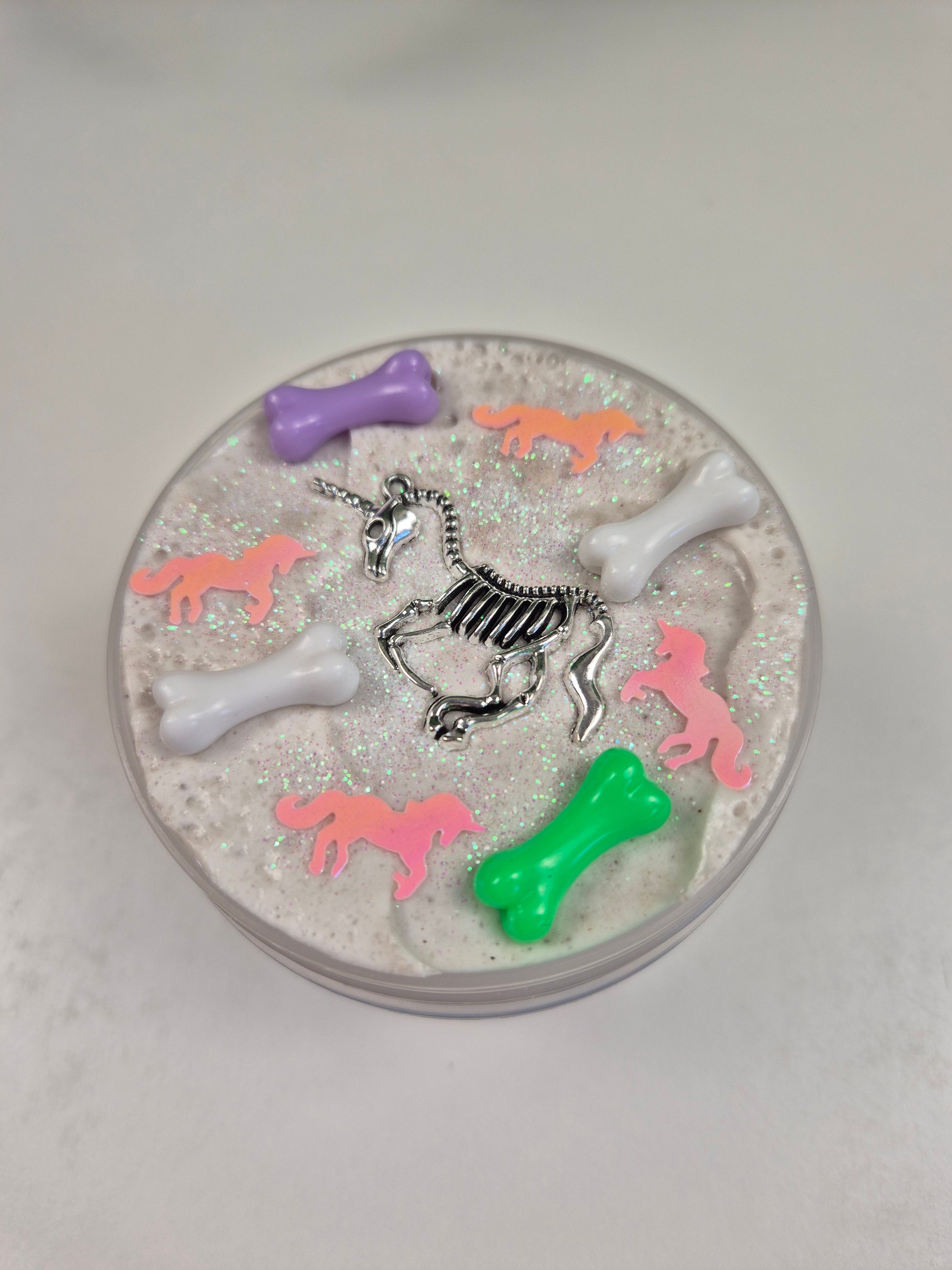 Included: 1 x Metal Unicorn Skeleton Charm, 4 x Bone Charms & 4 x Pink Iridescent Unicorn Sequins. Slime comes topped with iridescent glitter.
